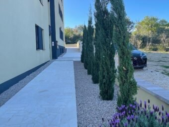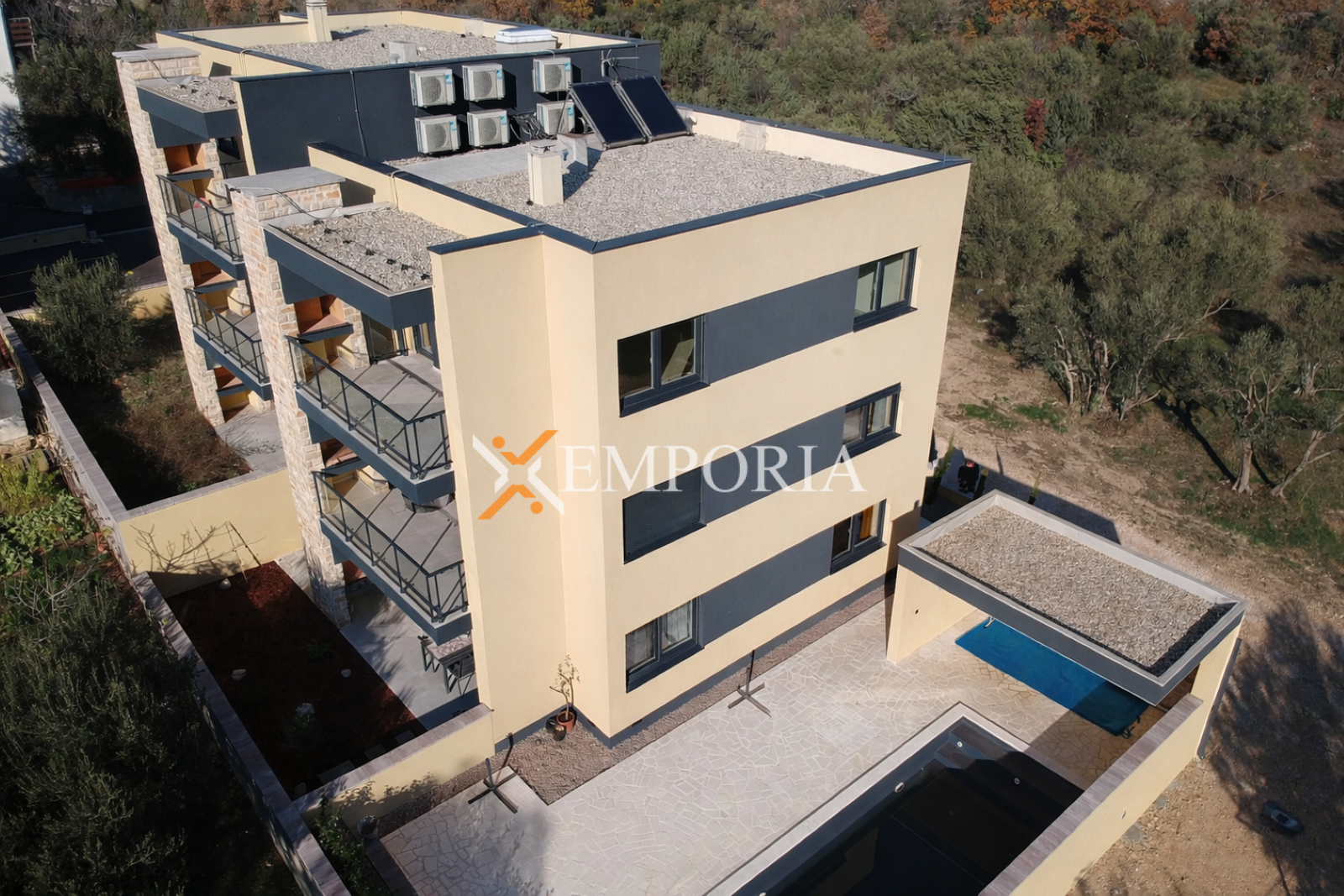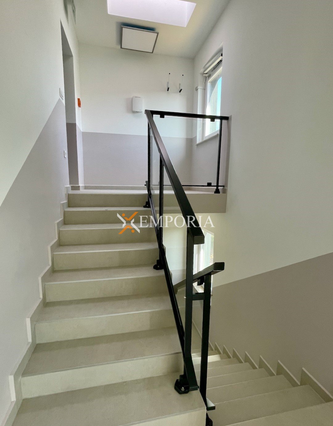 Godina izgradnje 2022. Ukupno 6 stanova u zgradi. Gradnja ciglom. Termoizolacija fasade 10 cm stiropor. Podne obloge su pločice. Salamander PVC stolarija s roletama. Na staklenim stijenama su rolete električne. Sustav grijanja i hlađenja putem dizalica topline. Uređaji za grijanje i hlađenje raspoređeni su u dnevnom boravku i u svakoj spavaćoj sobi po jedan, ukupno 4 klima uređaja. Nadalje, podno grijanja na struju u kupaonicama. Također, napravljene su instalacije za solarne panele. Na terasi je roštilj. Ulazna vrata su protuprovalna i protupožarna.