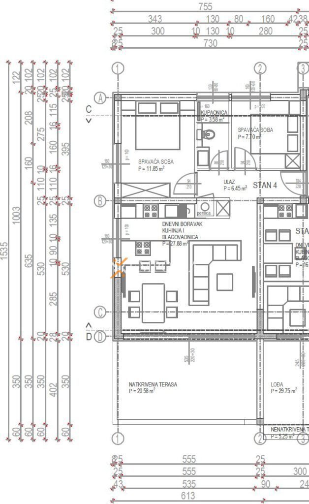 Ovo je stan na prvom katu. Raspored prostorija čine hodnik, 2 spavaće sobe, kupaonica, kuhinja s blagovaonicom i dnevnim boravkom te natkrivena terasa. Neto korisna površina opisanih prostorija s terasom iznosi 67,75 m2. Dodatno apartmanu pripadaju dva parkirališna mjesta.