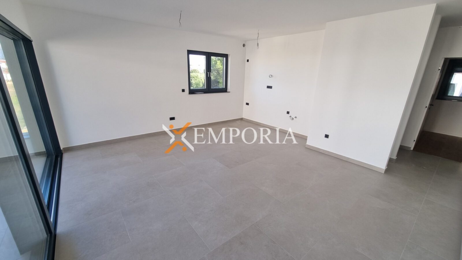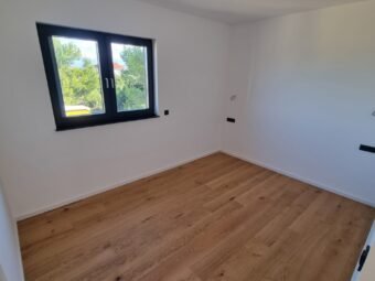 Gradnja ciglenim termo blokom. Termoizolacija fasade 10 cm stiropor. Podne obloge su pločice i parketi. Aluminijski prozori s troslojnim staklom, komarnicima te električnim roletama i žaluzinama. Klima uređaji su u dnevnom boravku i svakoj spavaćoj sobi. Osim toga, podno grijanje na struju u kupaonici. Nadalje, ulazna vrata su protuprovalna i protupožarna. Ovom apartmanu pripada vanjski tuš u dvorištu zgrade.