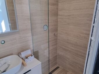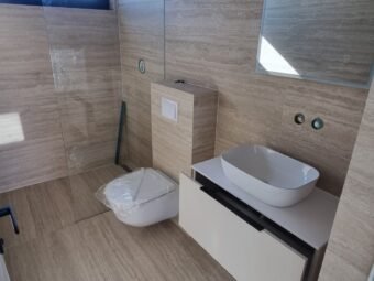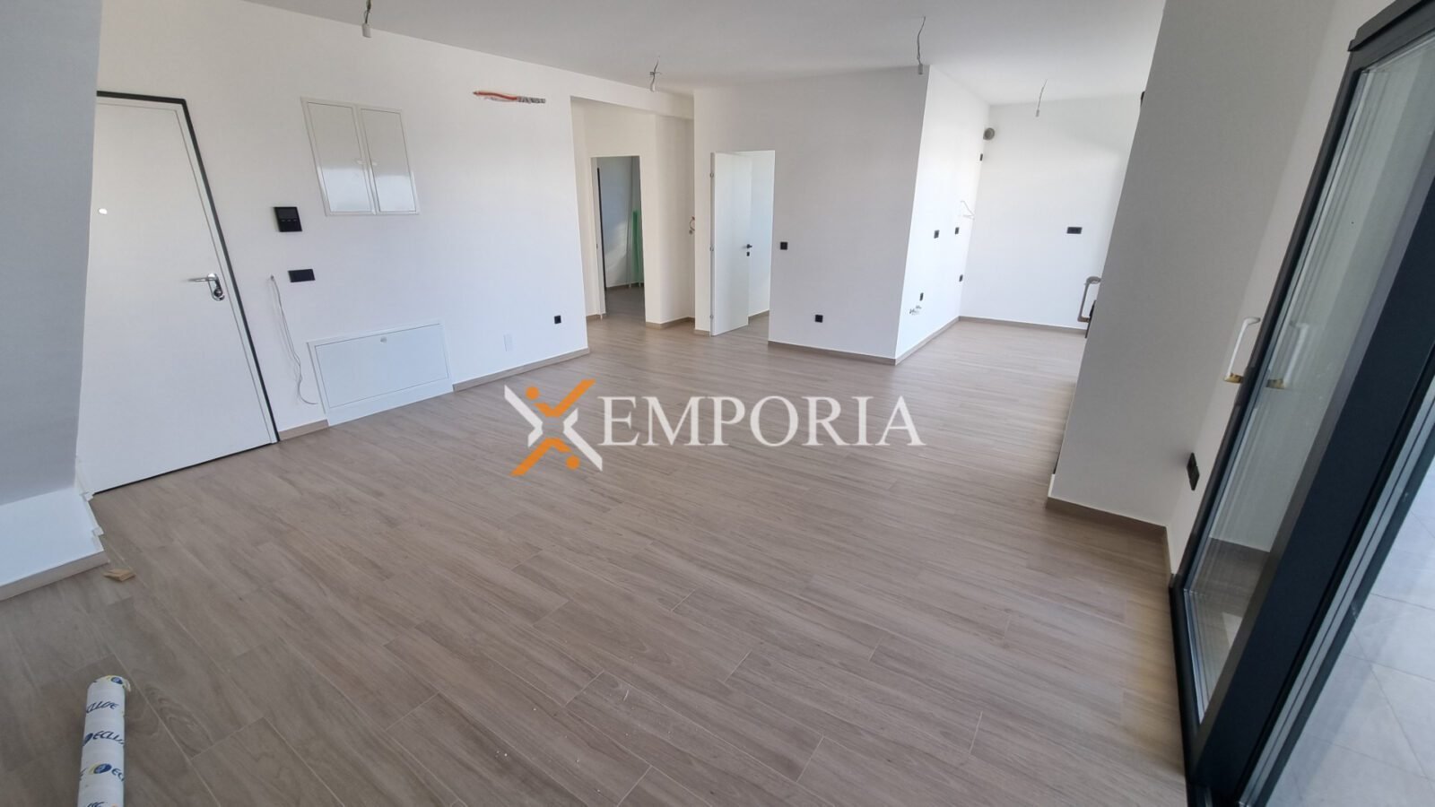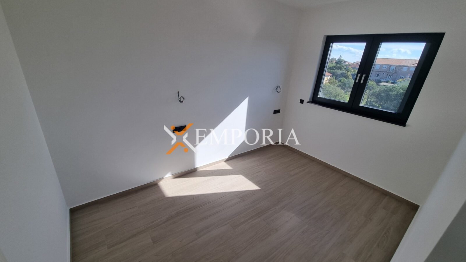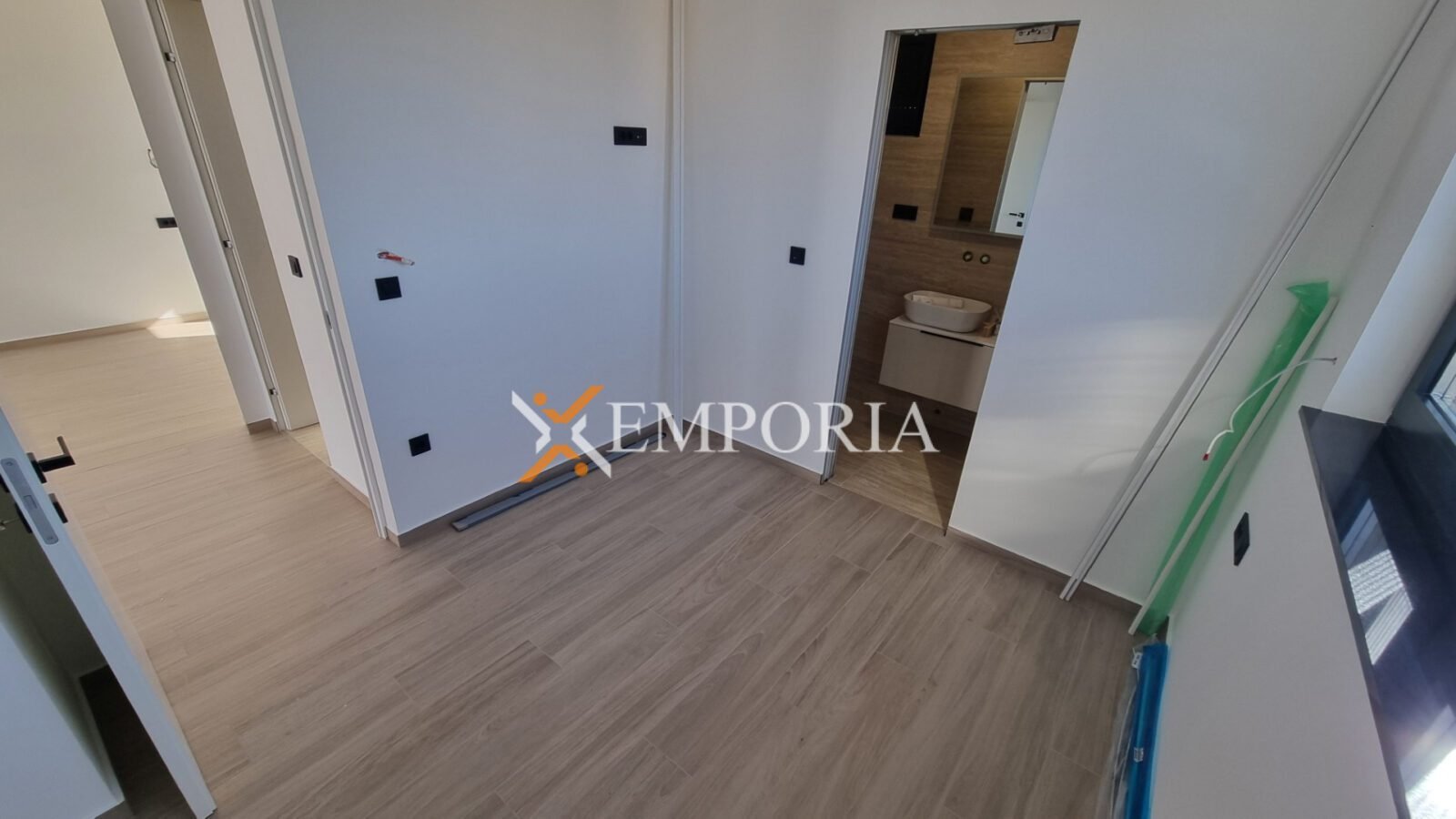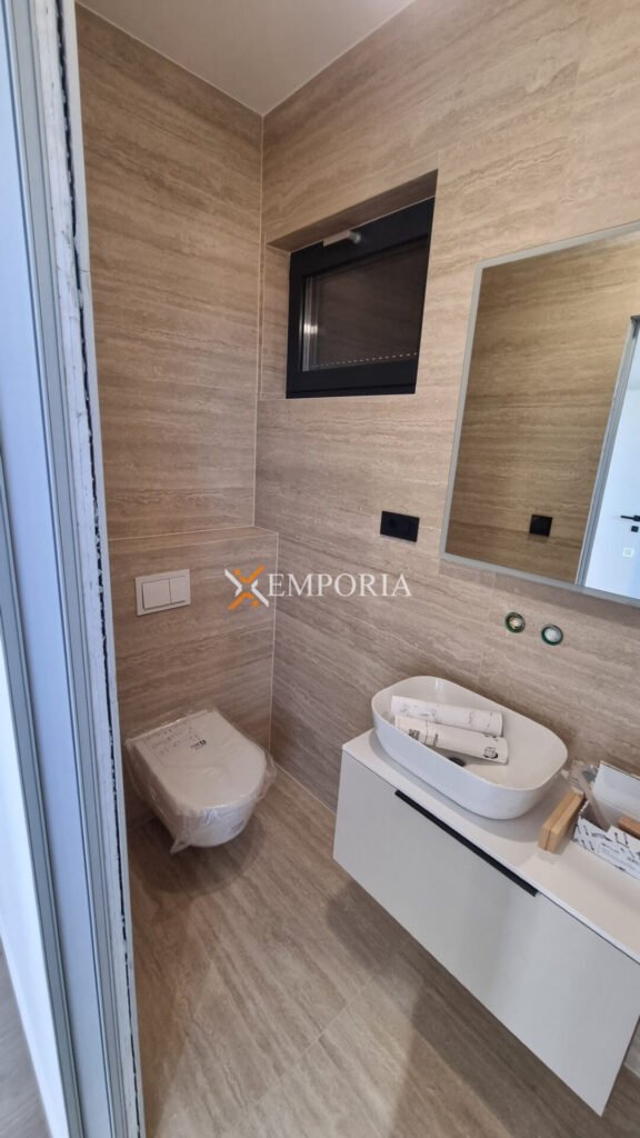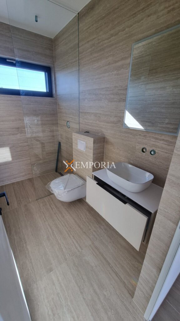 Gradnja ciglenim termo blokom. Termoizolacija fasade 10 cm stiropor. Podne obloge su pločice i parketi. Aluminijski prozori s troslojnim staklom, komarnicima te električnim roletama i žaluzinama. Klima uređaji su u dnevnom boravku i svakoj spavaćoj sobi. Osim toga, podno grijanje preko dizalica topline u cijelom stanu. Nadalje, ulazna vrata su protuprovalna i protupožarna. Ovom apartmanu pripada vanjski tuš u dvorištu zgrade.