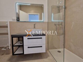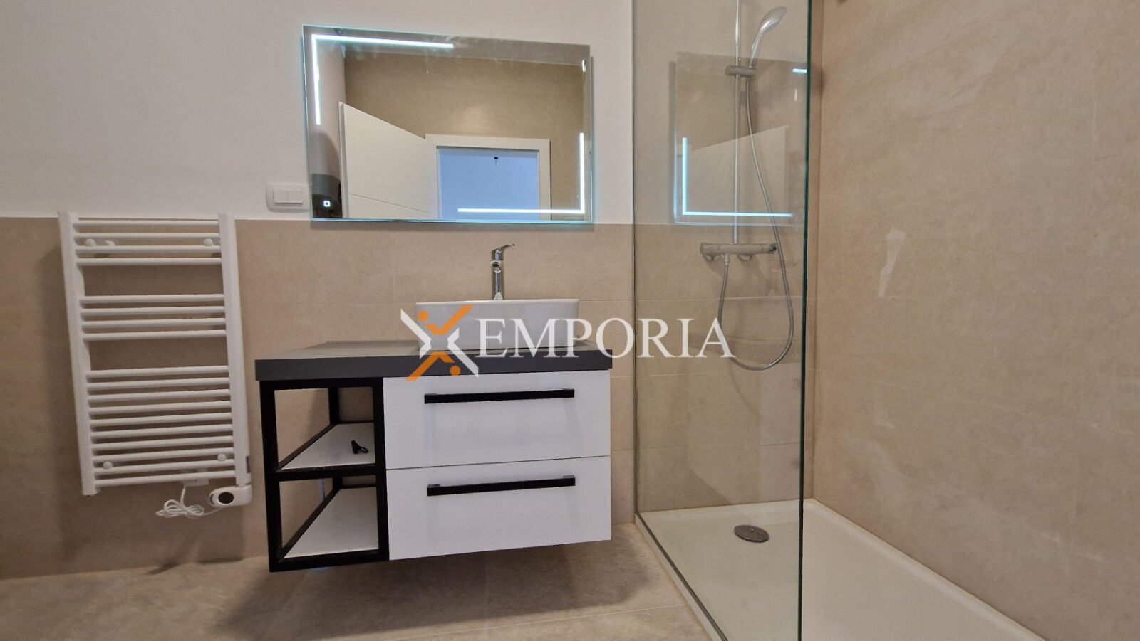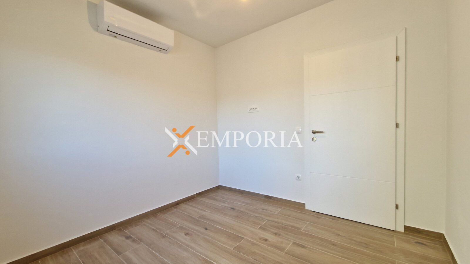 Gradnja ciglenim termo blokom. Termoizolacija fasade 10 cm stiropor. Podne obloge su pločice. PVC prozori s električnim roletama, troslojnim staklom i komarnicima. U stanu su 3 klima uređaja. Jedan klima uređaj je u dnevnom boravku, a ostala dva su u spavaćim sobama. Također, u stanu postoji priključak na dimnjak. Nadalje, ulazna vrata su protuprovalna i protupožarna.