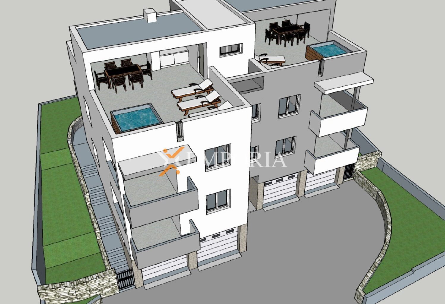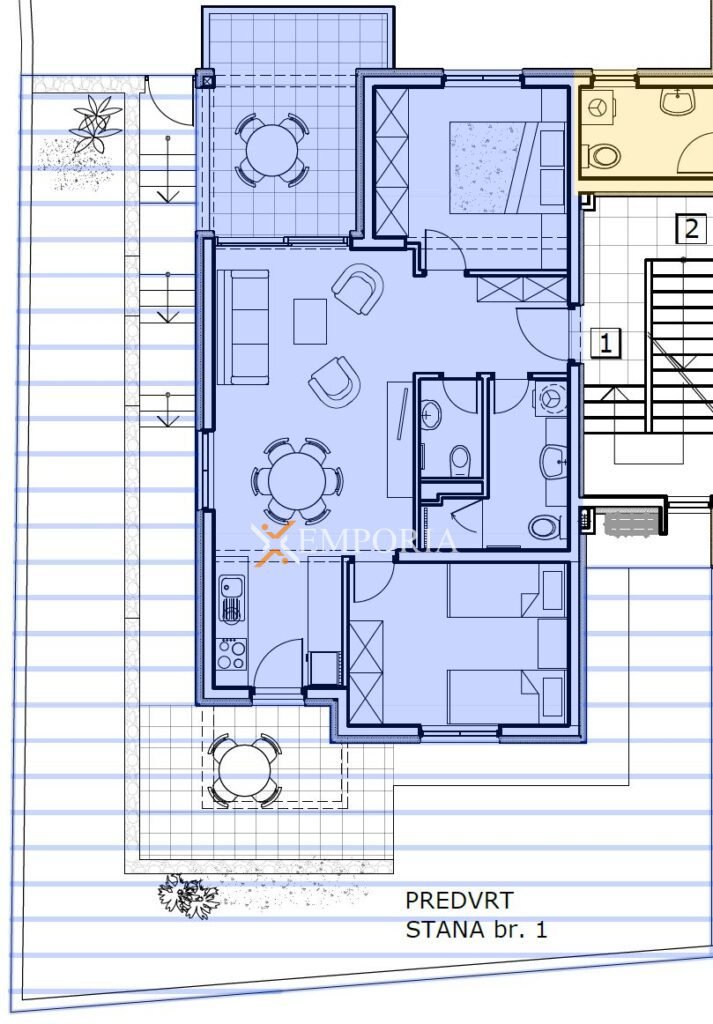 Raspored prostorija čine hodnik, 2 spavaće sobe, kupaonica, wc, kuhinja s blagovaonicom i dnevnim boravkom, lođa te dijelom natkrivena terasa. Neto korisna površina opisanih prostorija stana i terase iznosi 67,95 m2. Osim toga, stanu pripadaju suterenska garaža površine 24,67 i vrt od 85,78 m2.