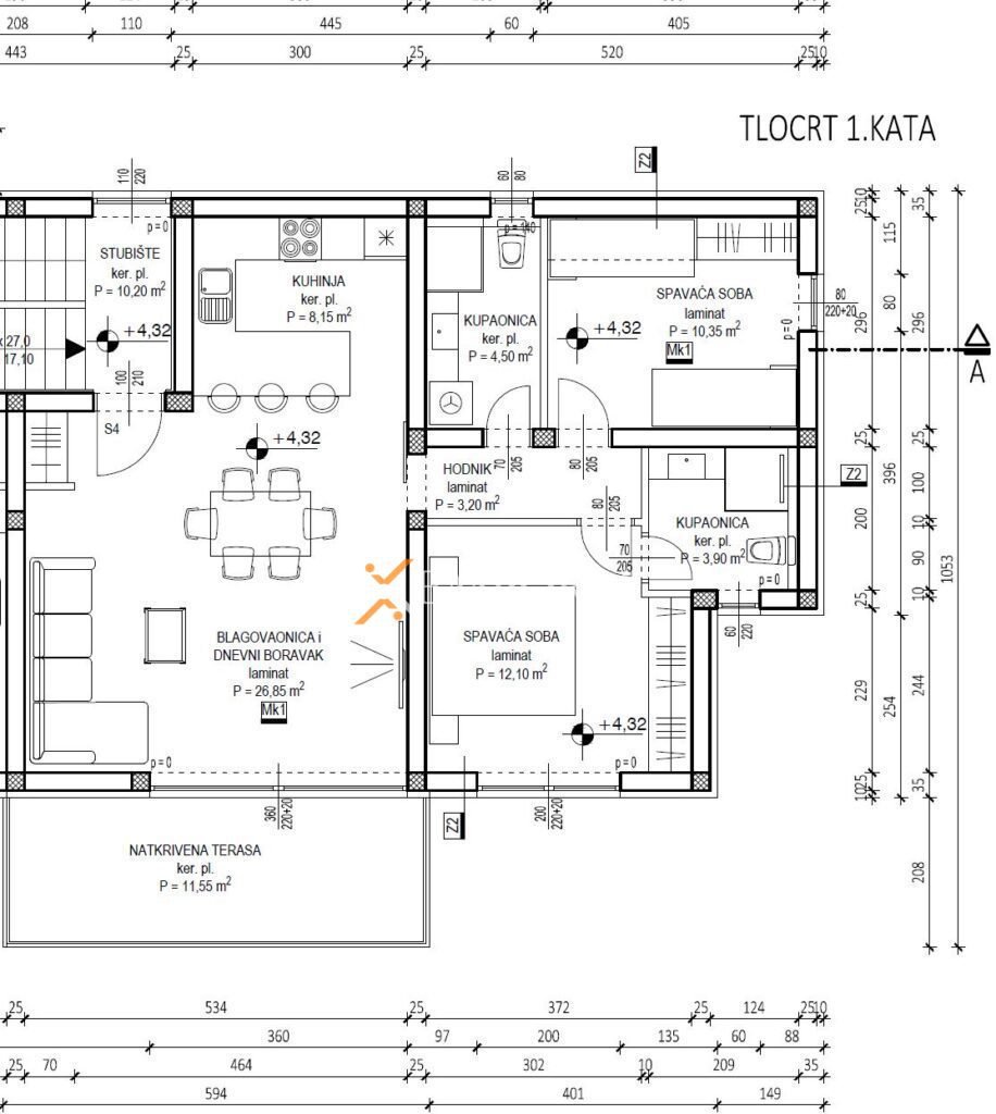 Ovo je stan na prvom katu. Raspored prostorija čine hodnik, spavaća soba, spavaća soba s kupaonicom, kupaonica, kuhinja s blagovaonicom i dnevnim boravkom te natkrivena terasa. Neto korisna površina stana s terasom iznosi 74,83 m2. Osim toga, apartmanu dodatno pripadaju 2 parkirališna mjesta.
