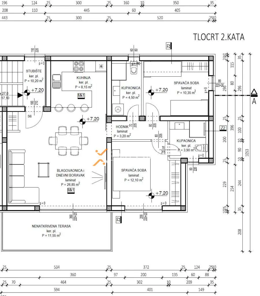 Ovo je stan na drugom katu. Raspored prostorija čine hodnik, spavaća soba, spavaća soba s kupaonicom, kupaonica, kuhinja s blagovaonicom i dnevnim boravkom te natkrivena terasa. Neto korisna površina stana s terasom iznosi 76,93 m2. Osim toga, apartmanu dodatno pripadaju 2 parkirališna mjesta te krovna terasa površine 72,10 m2. Krovnu terasu krase bazen, pergola i roštilj.