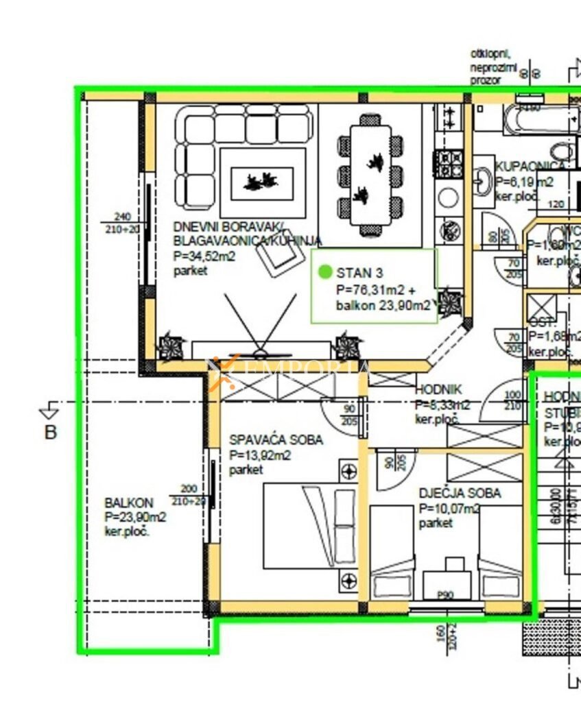 Ukupna neto korisna površina ovog apartmana s parkirališnim mjestom iznosi 90,76 m2.