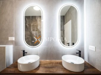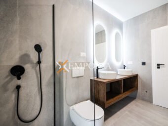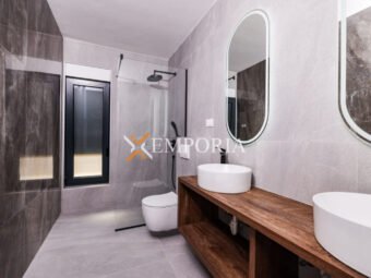 Gradnja zgrade ciglenim termoblokom s termoizolacijom fasade 10 cm stiropor. Podne obloge su pločice. Prozori su aluminijski s troslojnim staklom, električnim roletama i komarnicima. U svakoj spavaćoj sobi i u dnevnom boravku nalazi se klima uređaj. Osim toga, podno grijanje na struju u kupaonici. Nadalje, ulazna vrata stana su protuprovalna i protupožarna.