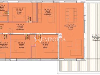 Raspored prostorija čine hodnik, kupaonica, dvije spavaće sobe, spavaća soba s vlastitom kupaonicom, kuhinja, blagovaonica i dnevni boravak te natkrivena terasa. Neto korisna površina opisanih prostorija iznosi 105,50 m2. Dodatno stanu pripadaju dva parkirališna mjesta ispred zgrade.