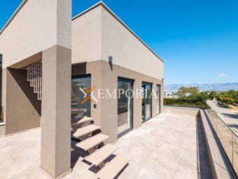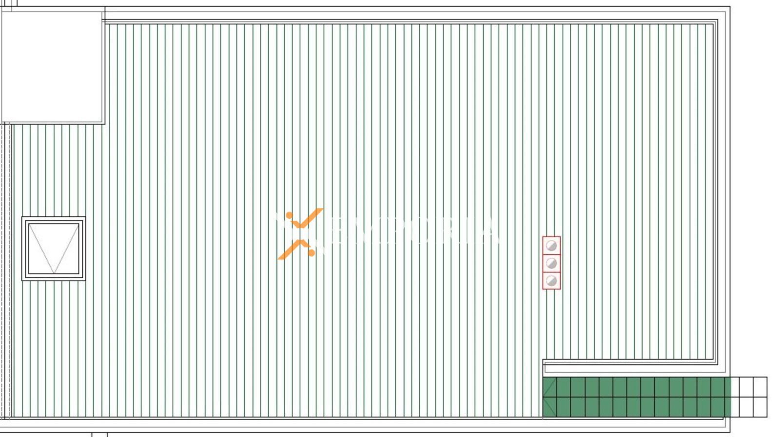 Raspored prostorija čine hodnik, kupaonica, dvije spavaće sobe, spavaća soba s vlastitom kupaonicom, kuhinja, blagovaonica i dnevni boravak te nenatkrivena terasa. S nenatkrivene terase se ide dalje na krovnu terasu površine 102,29 m2. Neto korisna površina opisanih prostorija iznosi 121,22 m2. Dodatno stanu pripadaju dva parkirališna mjesta ispred zgrade.