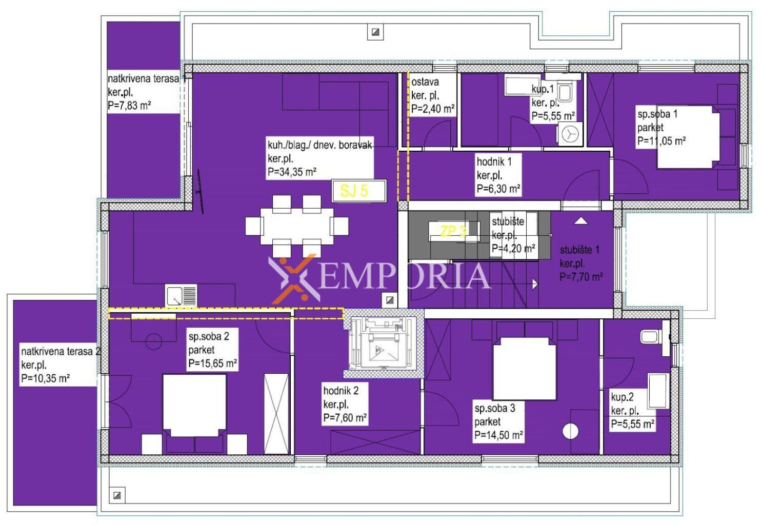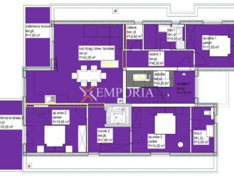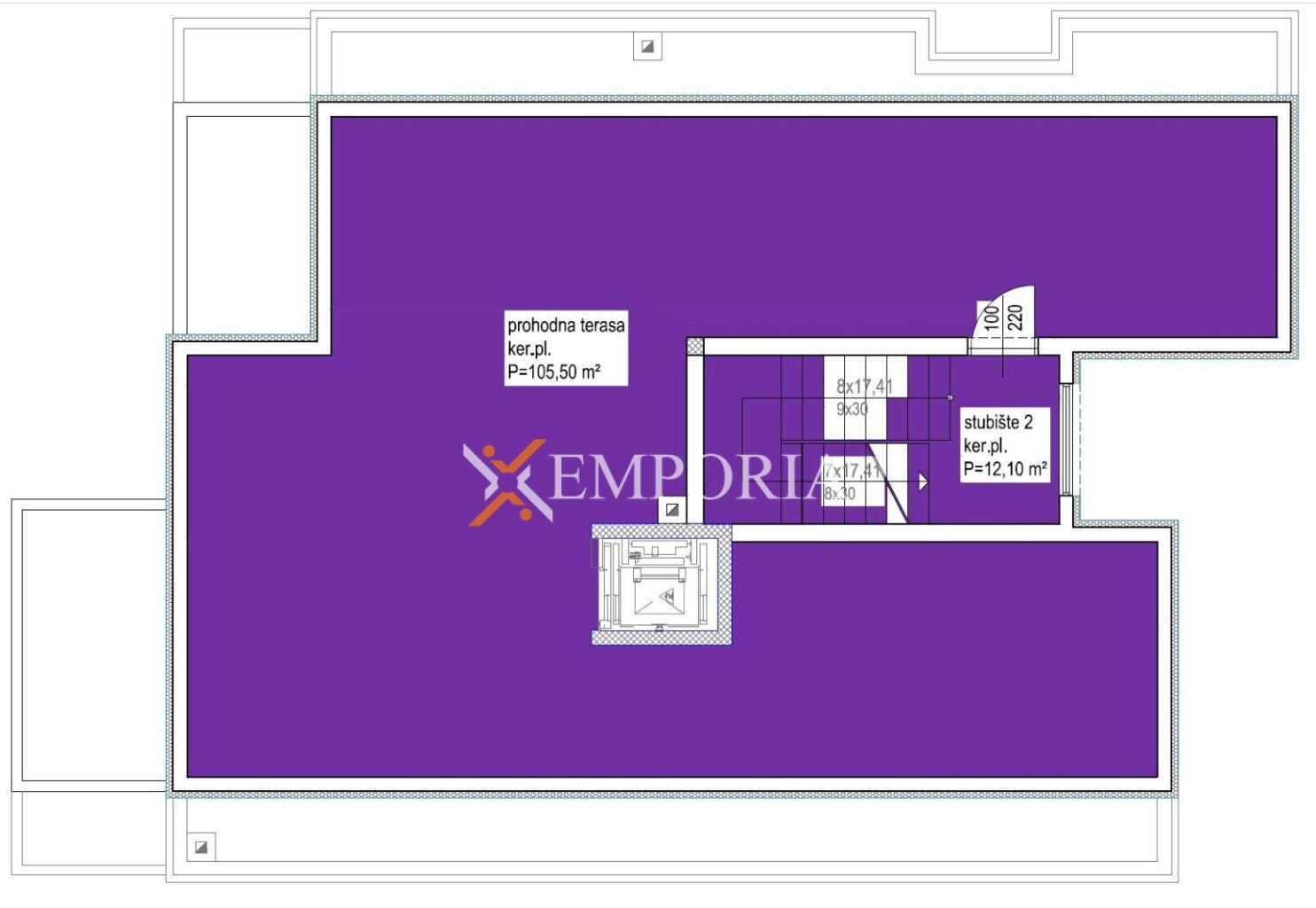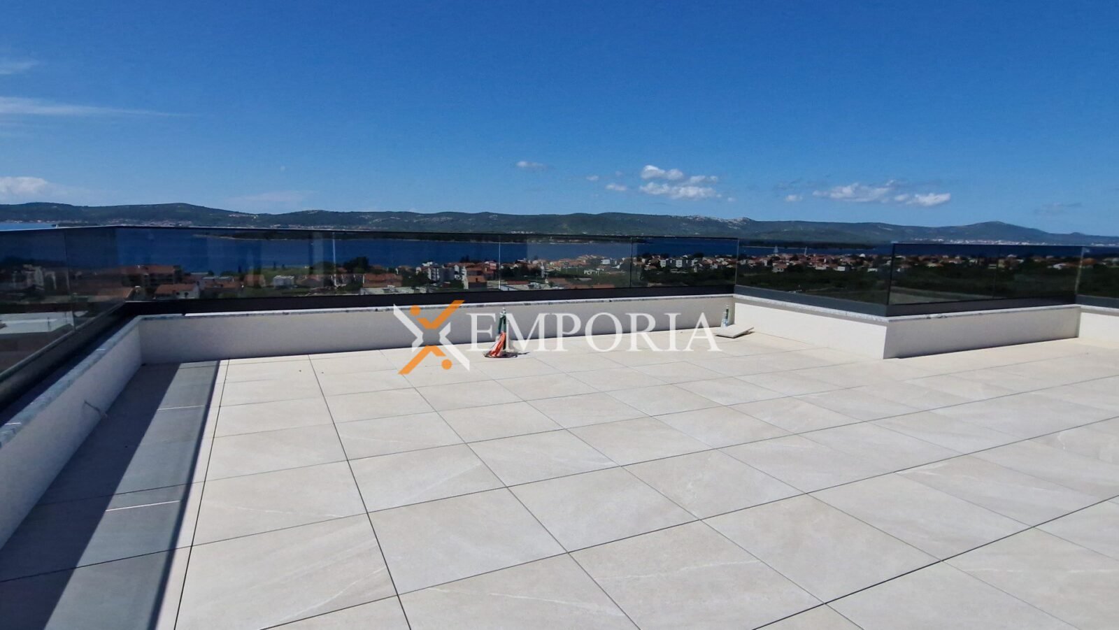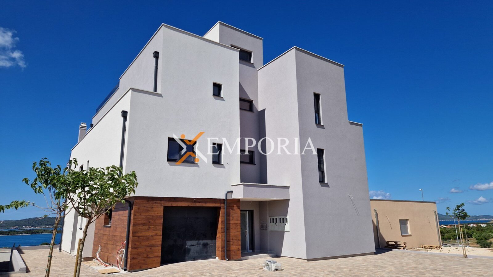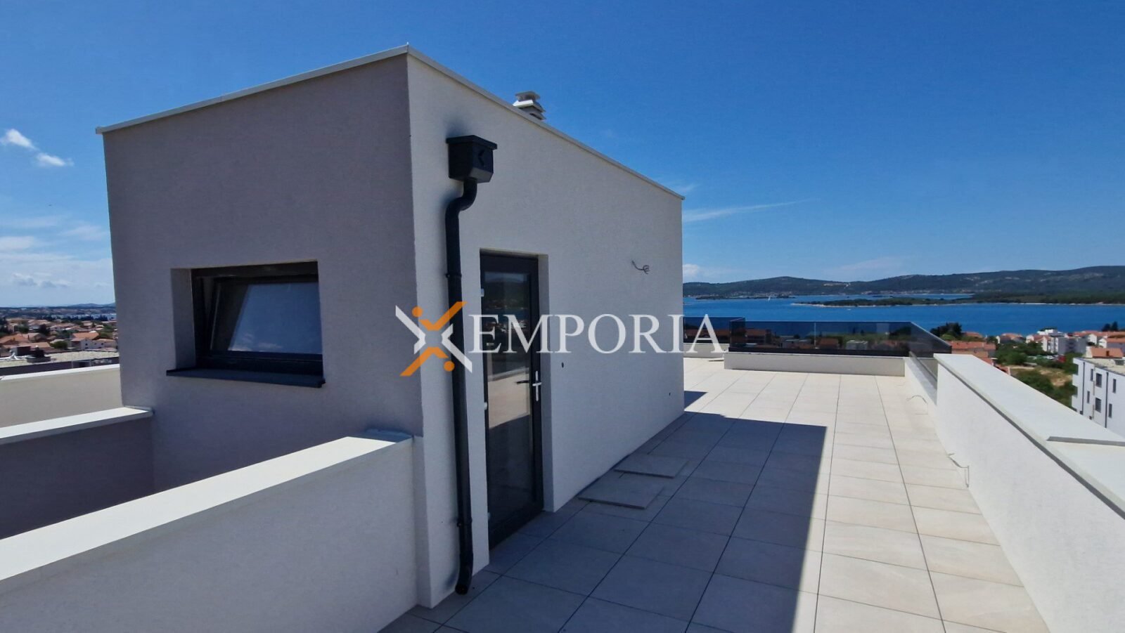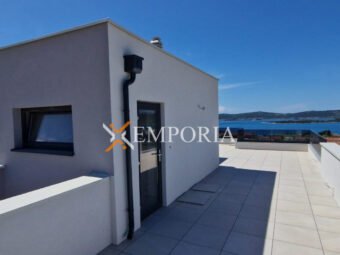 Prodaje se penthouse u novogradnji u Svetom Filip i Jakovu s prekrasnim pogledom na more. Stan se nalazi na drugom katu zgrade s 5 stanova te je ujedno i jedini stan na tom katu. Sastoji se od hodnika, 2 spavaće sobe, spavaće sobe s kupaonicom, kupaonice, kuhinje s blagovaonicom i dnevnim boravkom, ostave te 2 natkrivene terase. Dodatno stanu pripada krovna terasa od 105,50 m2 te vlastito dizalo. Neto korisna površina opisanih prostorija iznosi 160,25 m2. Osim toga stanu pripada garaža u prizemlju površine 24 m2 te jedno parkirališno mjesto ispred zgrade.