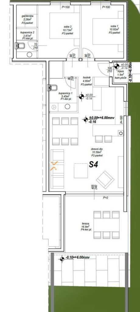 Dodatno stanu pripada vrt od 26,84 m2 i parkirališno mjesto ispred zgrade. Ukupna neto površina stana sa svim pripacima iznosi 88,43 m2.