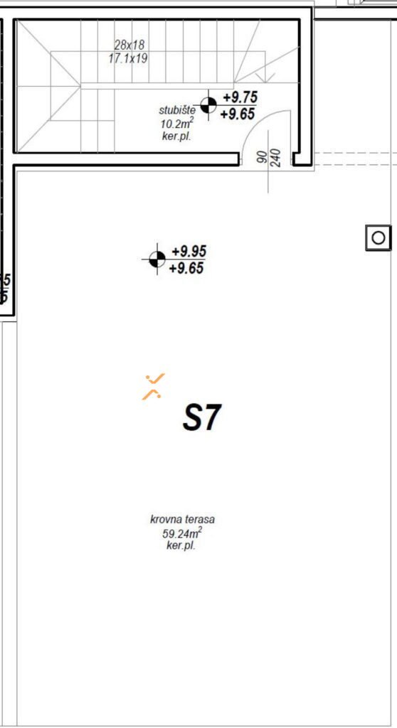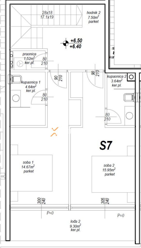 Raspored prostorija na 1. katu čine hodnik, WC, kuhinja s blagovaonicom i dnevnim boravkom te lođa. Unutarnje stepenice vode na drugi kat gdje se nalaze hodnik, dvije spavaće sobe s kupaonicom, praonica i lođa. Unutarnje stepenice vode dalje na krovnu terasu površine 59,24 m2. Neto korisna površina opisanih prostorija iznosi 127,49 m2.