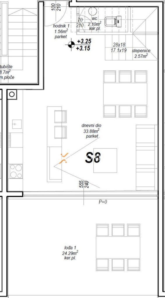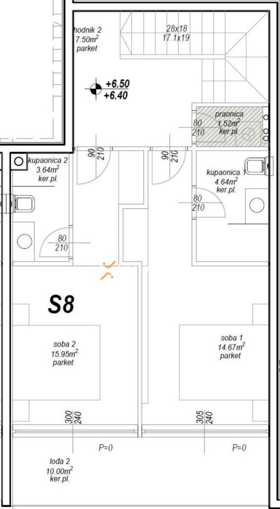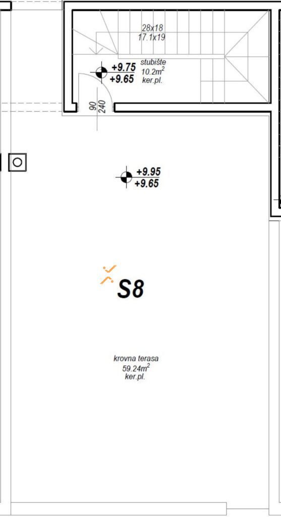 Raspored prostorija na 1. katu čine hodnik, WC, kuhinja s blagovaonicom i dnevnim boravkom te lođa. Unutarnje stepenice vode na drugi kat gdje se nalaze hodnik, dvije spavaće sobe s kupaonicom, praonica i lođa. Unutarnje stepenice vode dalje na krovnu terasu površine 59,24 m2. Neto korisna površina opisanih prostorija iznosi 127,49 m2.
