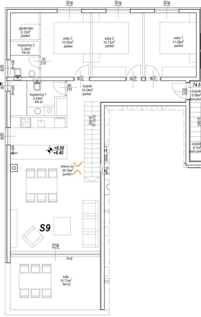Raspored prostorija čine hodnik, dvije spavaće sobe, spavaća soba s kupaonicom i garderobom, kupaonica, kuhinja s blagovaonicom i dnevnim boravkom te lođa. Unutarnje stepenice vode na krovnu terasu površine 110,25 m2. Neto korisna površina opisanih prostorija iznosi 133,17 m2.