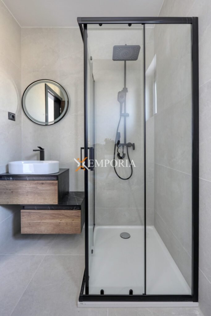 Gradnja zgrade vrši se ciglenim termo blokom. Termoizolacija fasade je stiropor debljine 10 cm. Prozori su od PVC materijala s troslojnim staklom, roletama i komarnicima. Podne obloge su pločice i laminat. Grijanje je podno električno u cijelom stanu. Osim toga, u dnevnom boravku i spavaćim sobama bit će postavljeni klima uređaji.