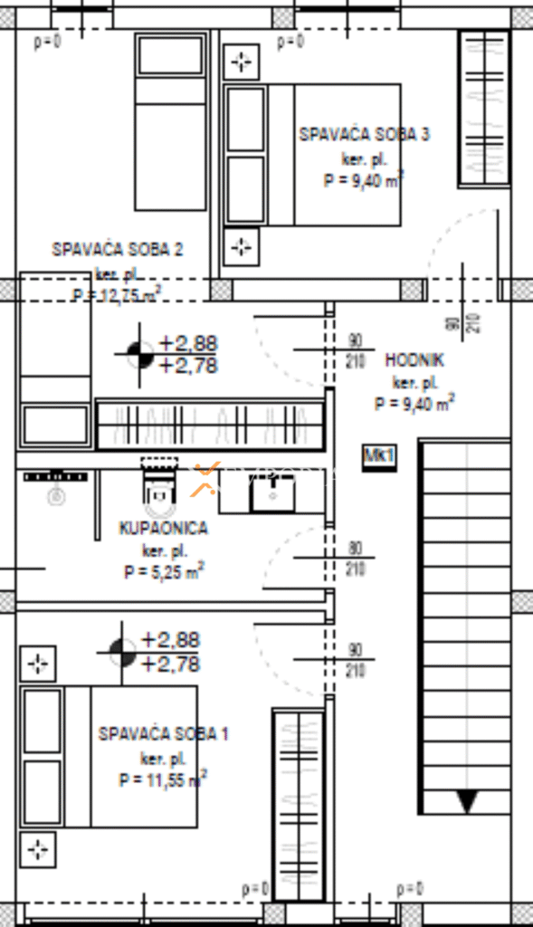 Gradnja zgrade vrši se ciglenim termo blokom. Termoizolacija fasade je stiropor debljine 10 cm. Prozori su od PVC materijala s troslojnim staklom, roletama i komarnicima. Podne obloge su pločice i laminat. Grijanje je podno električno u cijelom stanu. Osim toga, u dnevnom boravku i spavaćim sobama bit će postavljeni klima uređaji.