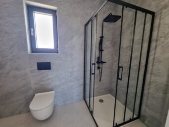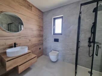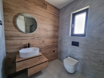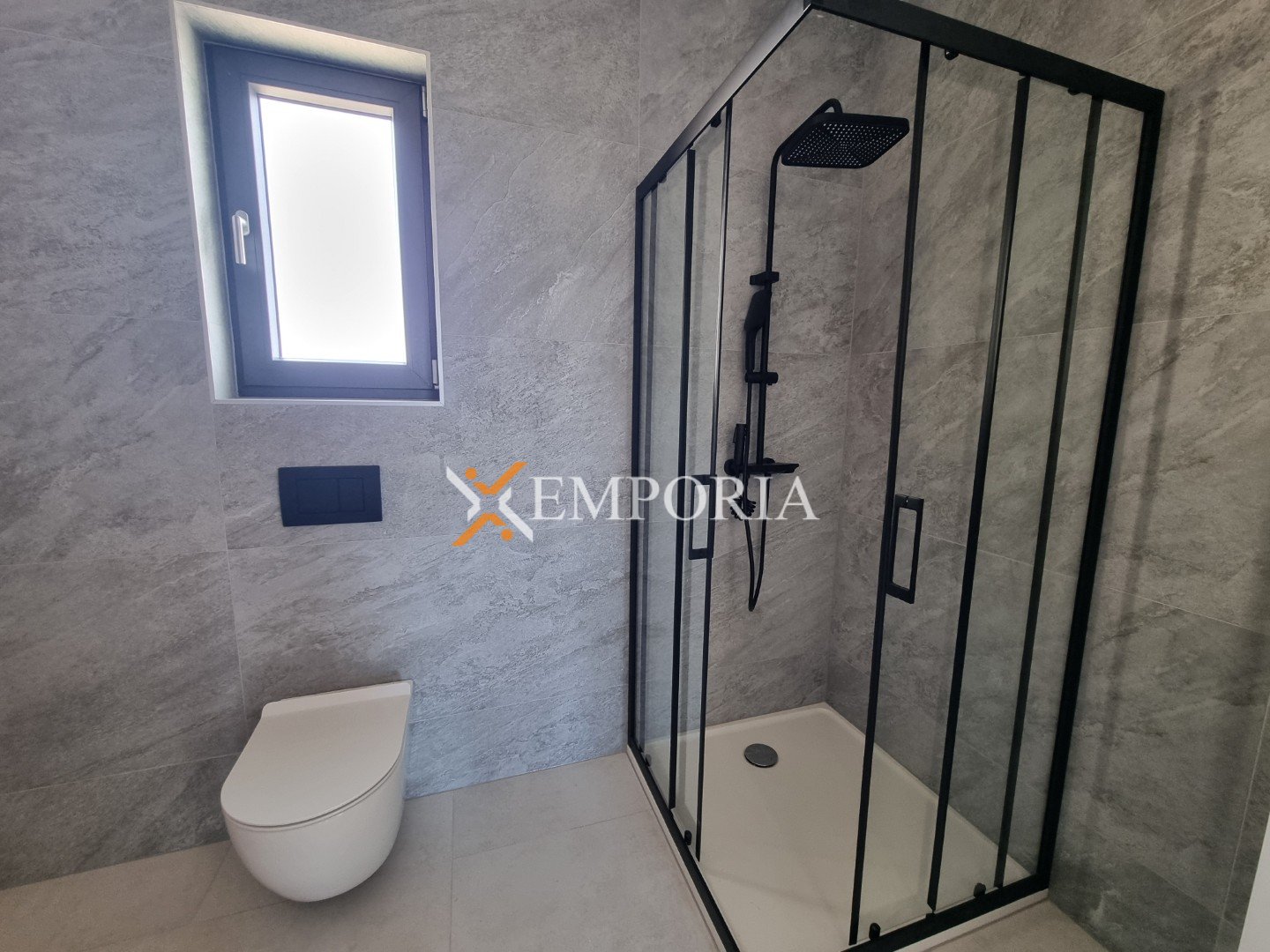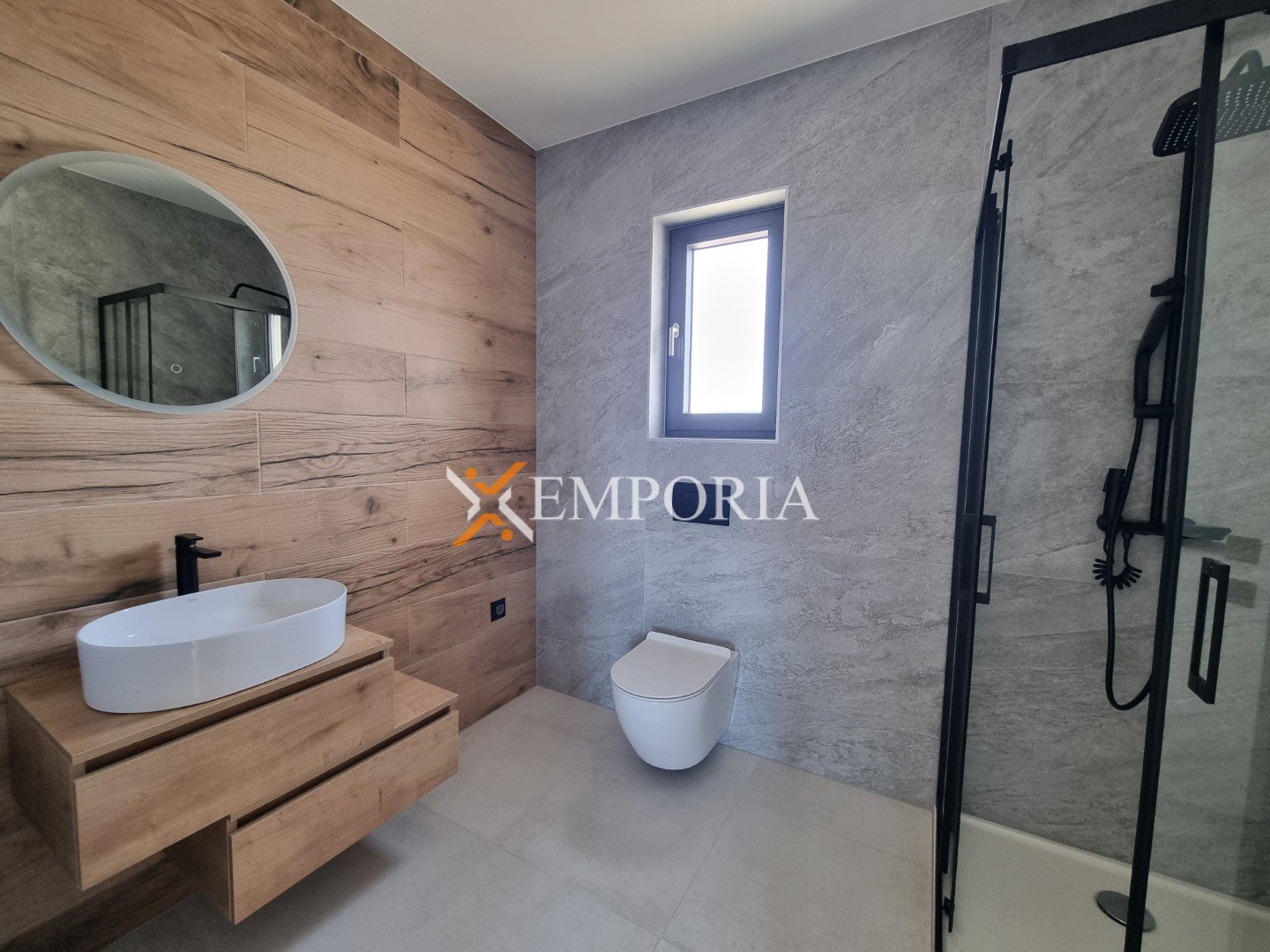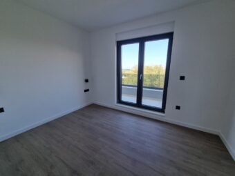 Gradnja zgrade vrši se ciglenim termo blokom. Termoizolacija fasade je stiropor debljine 8 cm. Prozori su od PVC materijala s troslojnim staklom, roletama i komarnicima. Podne obloge su pločice i laminat. Podno električno grijanje u cijelom stanu. Osim toga, u dnevnom boravku i spavaćim sobama bit će postavljeni klima uređaji. Nadalje, ulazna vrata stana su protuprovalna i protupožarna.