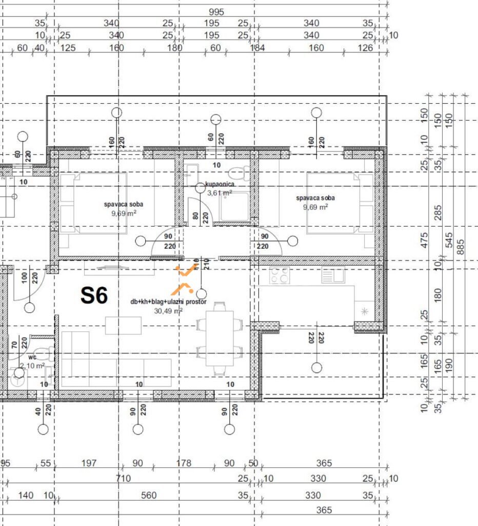 Apartman se nalazi na 2. katu zgrade. Raspored prostorija čine hodnik, kupaonica, dnevni boravak s kuhinjom i blagovaonicom, dvije spavaće sobe te natkrivena terasa (neto 60,21 m2). Iz stubišta se ide na krovnu terasu površine 67,06 m2. Neto korisna površina opisanih prostorija iznosi 76,98 m2.