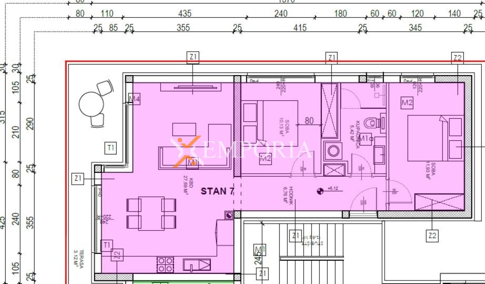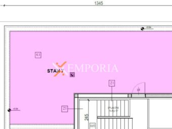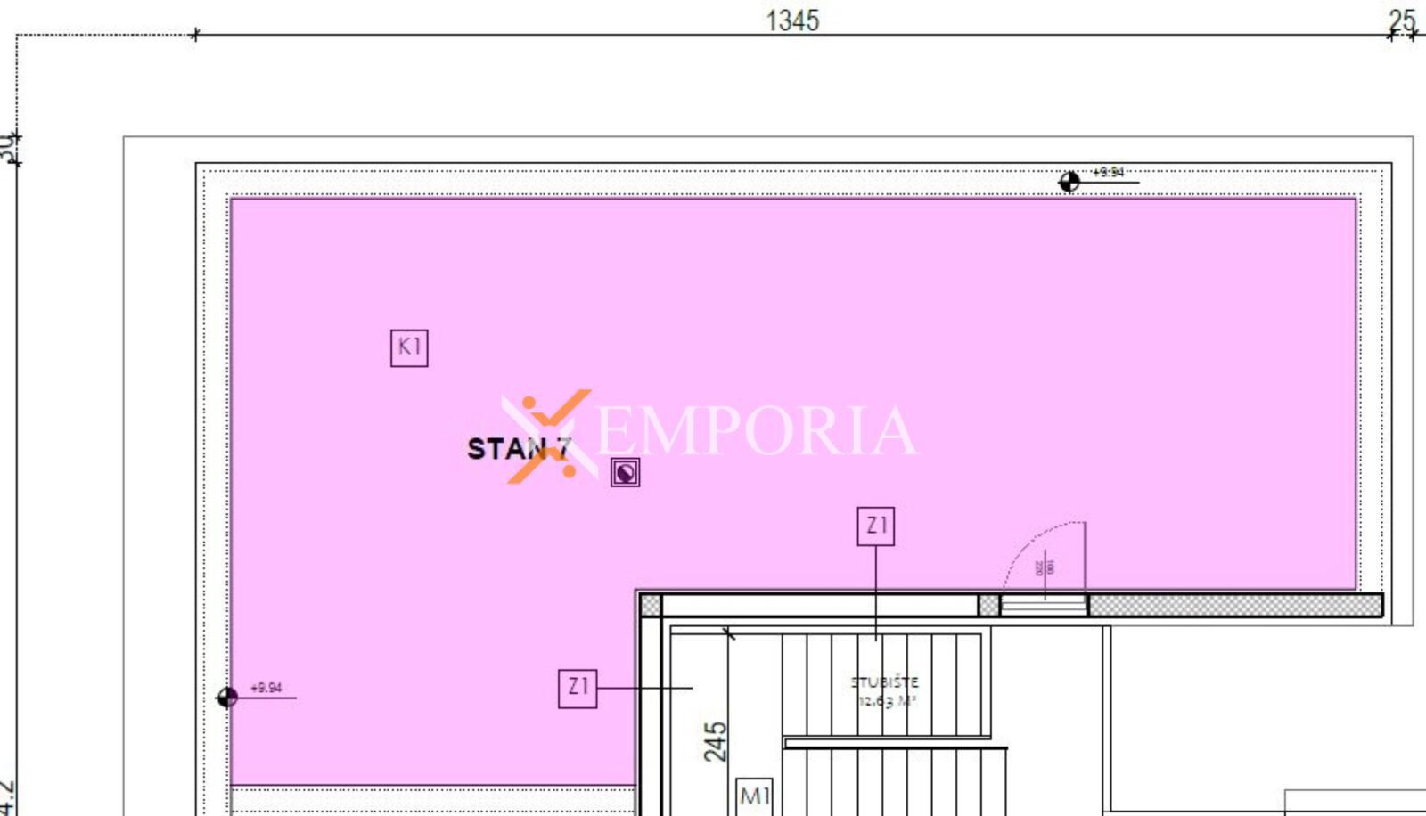 Stan se sastoji od kuhinje s blagovaonicom i dnevnim boravkom, dvije spavaće sobe, kupaonice, hodnika i natkrivene terase. Neto korisna površina opisanih prostorija iznosi 66,41 m². Iz stubišta se pristupa krovnoj terasi površine 65,67 m².