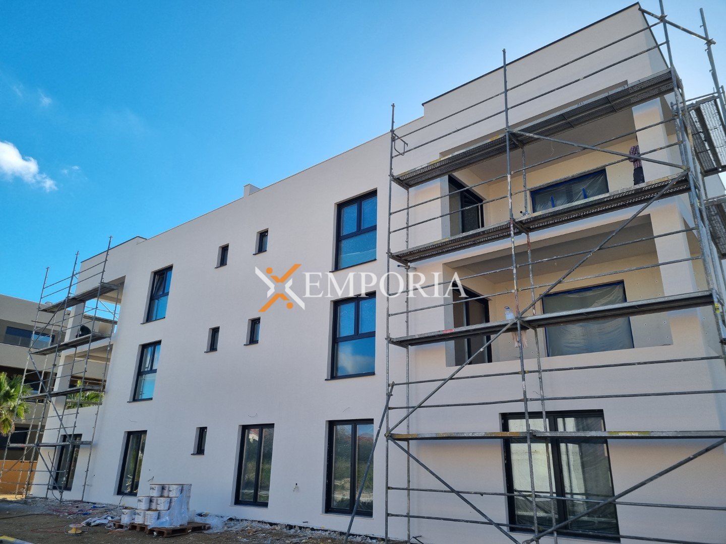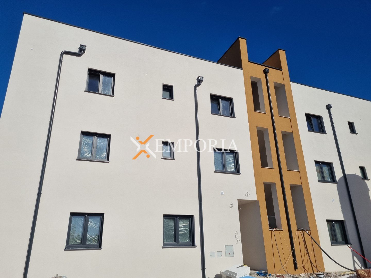 Zgrada se gradi od ciglenog termo bloka i izolira stiropor fasadom debljine 10 cm. Prozori su PVC s troslojnim staklom, električnim roletama i komarnicima. Podovi su kombinacija keramičkih pločica i laminata u spavaćim sobama. Ulazna vrata su protuprovalna i protupožarna.