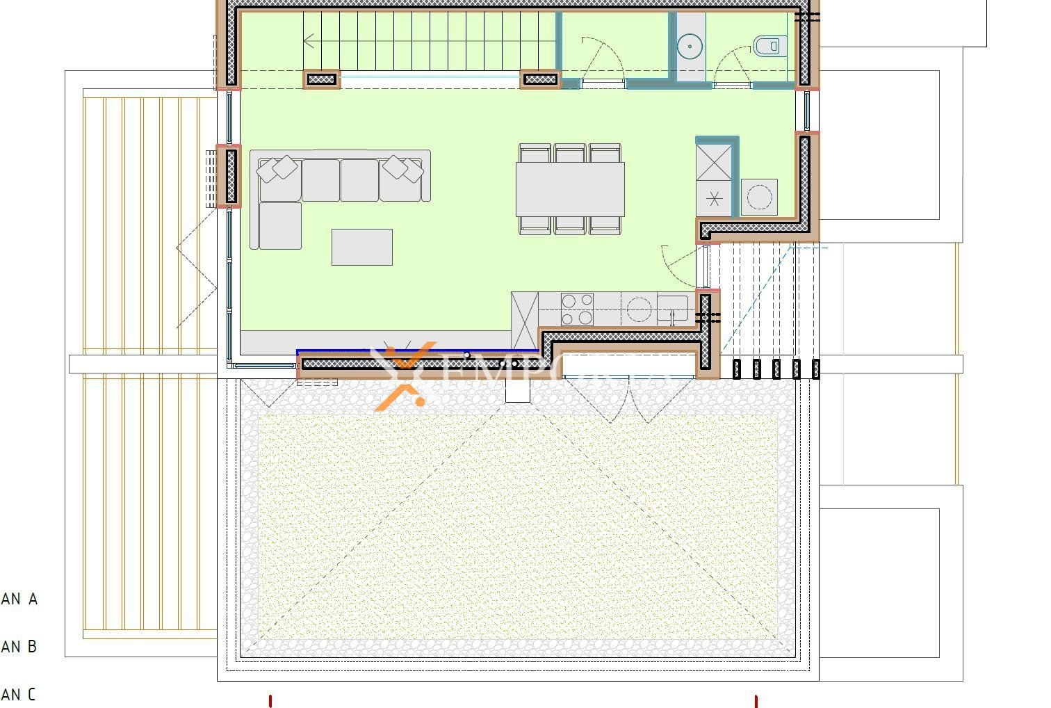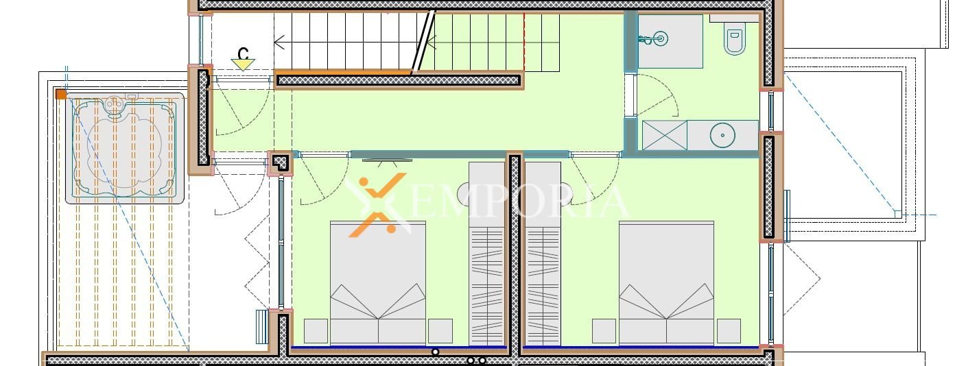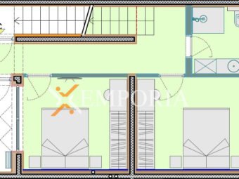 Na prvoj etaži nalaze se hodnik, kupaonica, dvije spavaće sobe te djelomično natkrivena terasa. Unutarnjim stubištem dolazi se na gornju etažu, gdje su smješteni hodnik, kuhinja, blagovaonica i dnevni boravak, dodatni WC, ostava te nenatkrivena terasa.