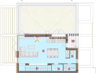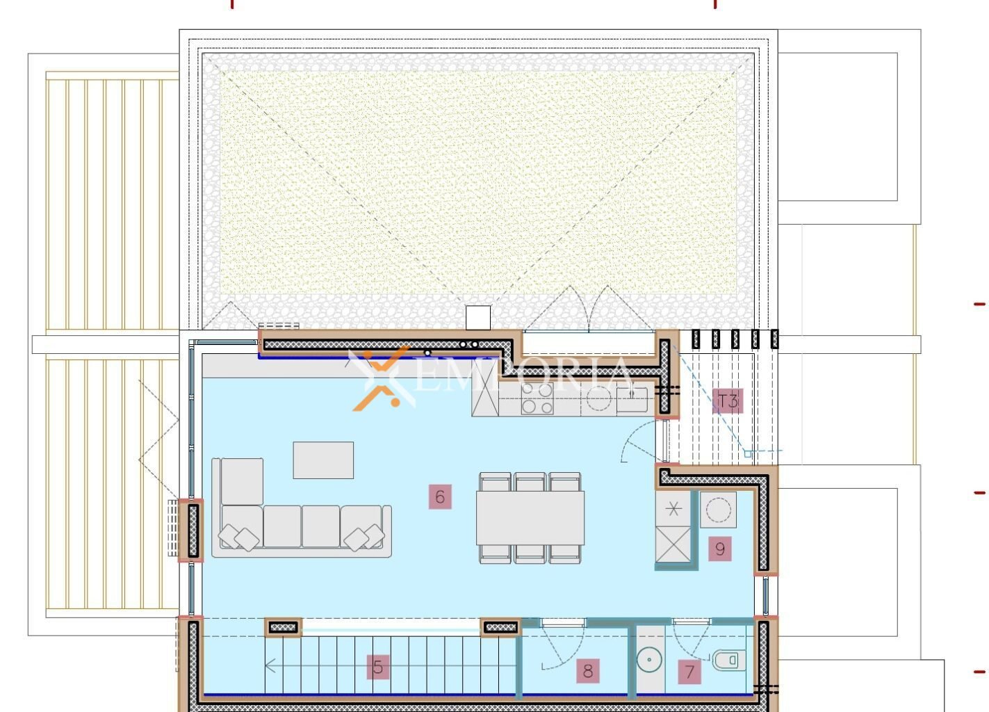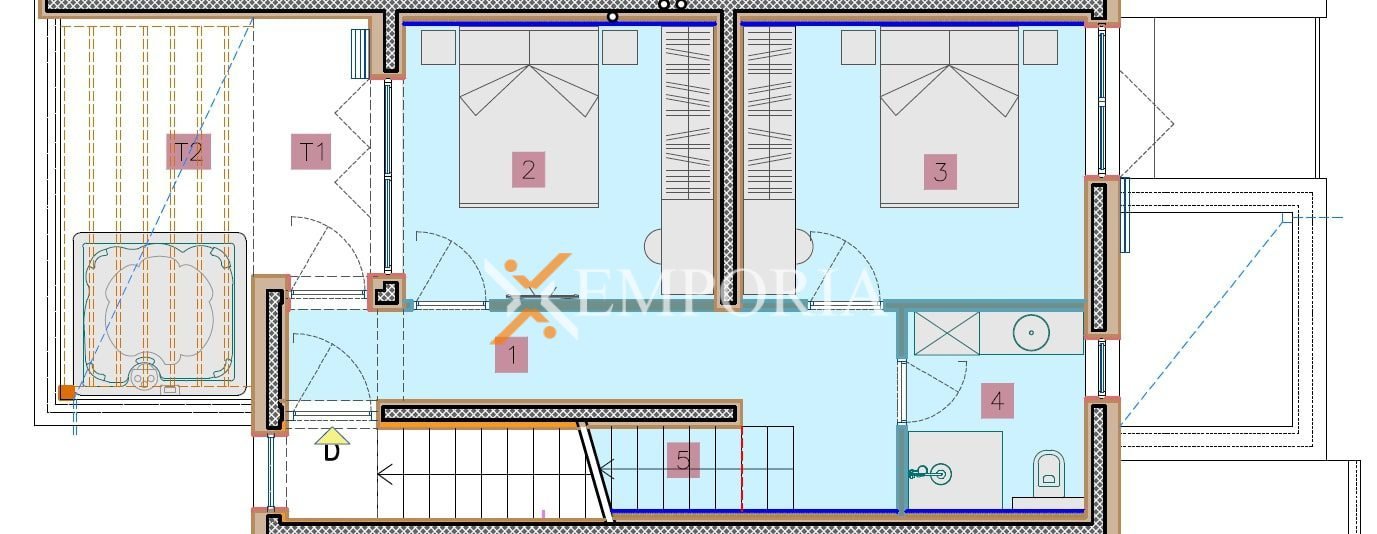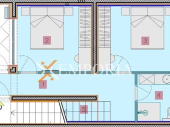 Na prvoj etaži nalaze se hodnik, kupaonica, dvije spavaće sobe i djelomično natkrivena terasa. Unutarnjim stubištem dolazi se na gornju etažu gdje su hodnik, kuhinja, blagovaonica, dnevni boravak, dodatni WC, ostava te nenatkrivena terasa.