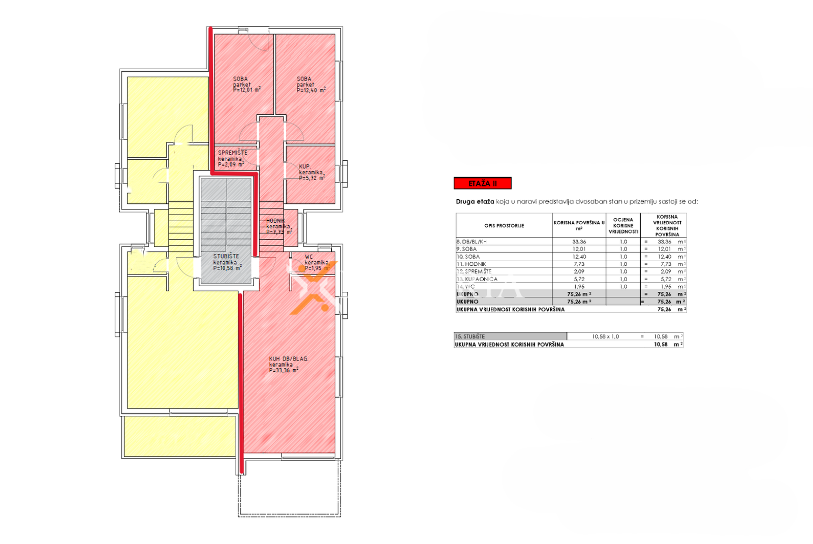 Neto površina zatvorenog dijela stana iznosi 75,26 m², dok ukupna neto površina s pripacima doseže 92,55 m². Stanu pripadaju dva vanjska parkirna mjesta te uređeni vrt s popločanim i zelenim dijelovima.