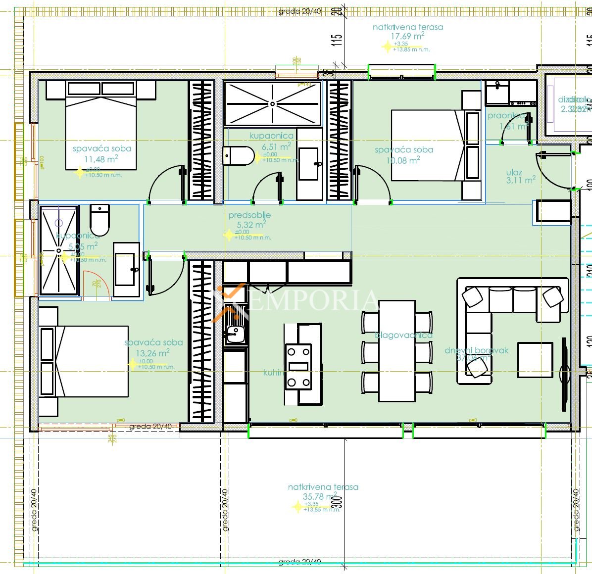Raspored prostorija uključuje hodnik, dvije spavaće sobe, spavaću sobu s vlastitom kupaonicom, dodatnu kupaonicu, praonicu, kuhinju povezanu s blagovaonicom i dnevnim boravkom te dvije natkrivene terase.