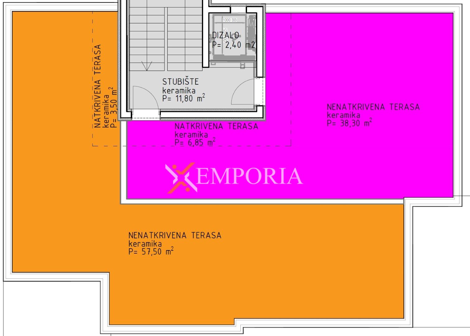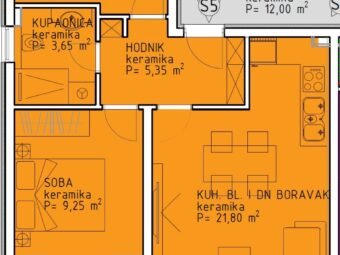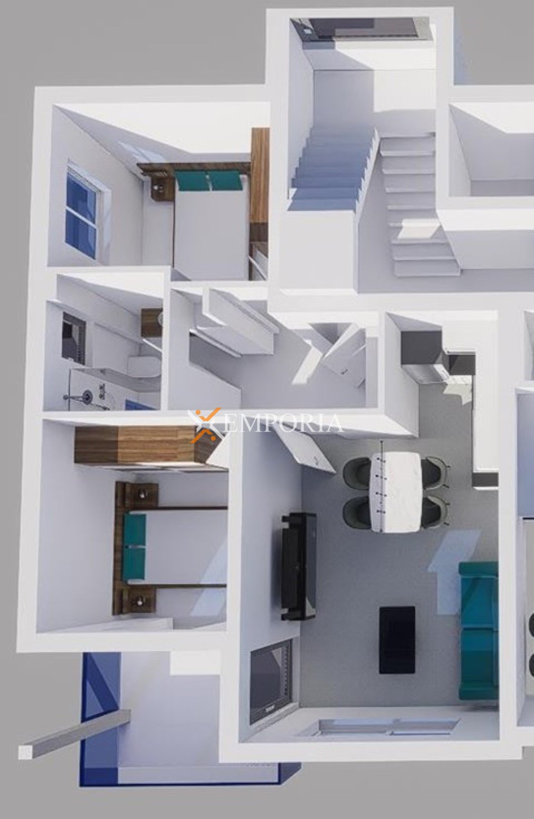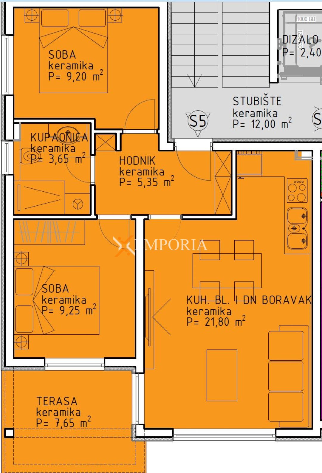 Apartman je smješten na drugom katu moderne zgrade s liftom, koji ide od podruma sve do krovnih terasa. Raspored prostorija obuhvaća hodnik, dvije spavaće sobe, kupaonicu te kuhinju s blagovaonicom i dnevnim boravkom s izlazom na natkrivenu terasu. Neto površina stambenog dijela s terasom iznosi 53,08 m². Iz stubišta se pristupa krovnoj terasi površine 61 m², od čega je 3,50 m² natkriveno, što pruža dodatni komfor i prostor za boravak na otvorenom. Neto korisna površina opisanih prostorija iznosi 69,21 m².
