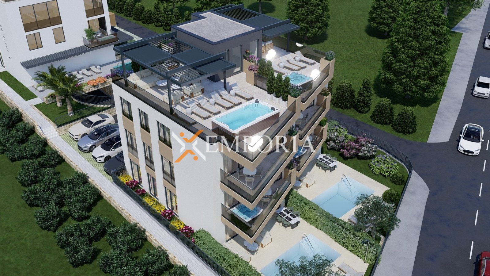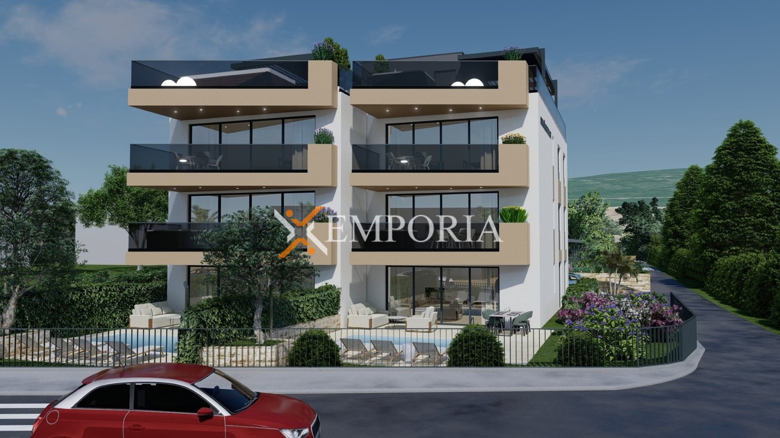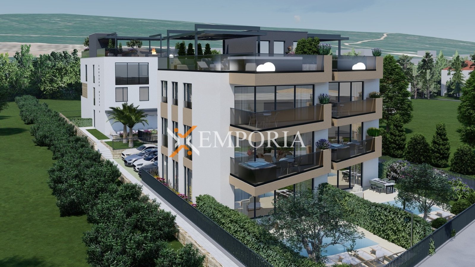 Apartman je funkcionalno projektiran, a raspored čine hodnik, dvije spavaće sobe, spavaća soba s vlastitom kupaonicom, dodatna kupaonica te kuhinja s blagovaonicom i dnevnim boravkom u otvorenom konceptu. Iz dnevnog dijela izlazi se na natkrivenu terasu, idealnu za boravak na otvorenom tijekom cijele godine. Neto korisna površina opisanih prostorija iznosi 85,46 m², dok ukupna neto površina s pripadcima iznosi 88,01 m². Apartmanu dodatno pripada jedno parkirno mjesto.
