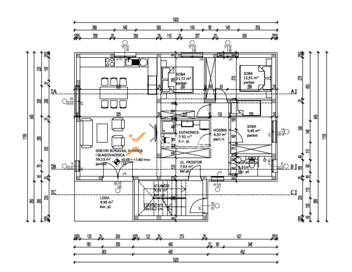 Raspored prostorija čine ulazni prostor s hodnikom, tri spavaće sobe, dvije kupaonice, dnevni boravak s blagovaonicom i kuhinjom otvorenog koncepta te natkrivena terasa. Neto korisna površina opisanih prostorija iznosi 97,75 m2. Stanu dodatno pripadaju dva parkirna mjesta ukupne površine 7,50 m2, a ukupna neto površina s pripacima iznosi 105,25 m2.