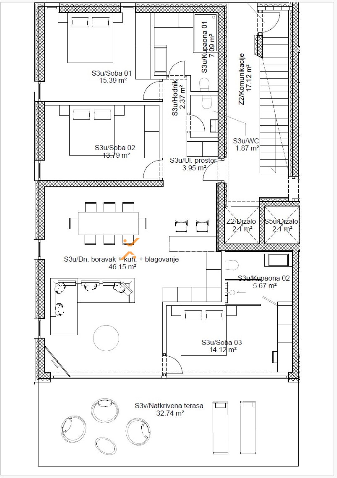 Raspored prostorija čine hodnik, dvije spavaće sobe, glavna spavaća soba s vlastitom kupaonicom, dodatna kupaonica, zaseban wc, kuhinja s blagovaonicom i dnevnim boravkom otvorenog koncepta te natkrivena terasa s pogledom na more. Neto korisna površina opisanih prostorija iznosi 128,99 m2, dok ukupna neto površina s pripacima iznosi 157,88 m2.