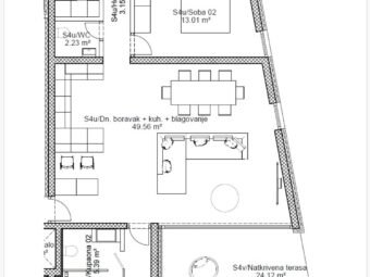 Raspored prostorija čine hodnik, dvije spavaće sobe, glavna spavaća soba s vlastitom kupaonicom, dodatna kupaonica, zaseban wc, kuhinja s blagovaonicom i dnevnim boravkom otvorenog koncepta te natkrivena terasa s panoramskim pogledom na more. Neto korisna površina opisanih prostorija iznosi 125,42 m2, dok ukupna neto površina s pripacima iznosi 148,09 m2.