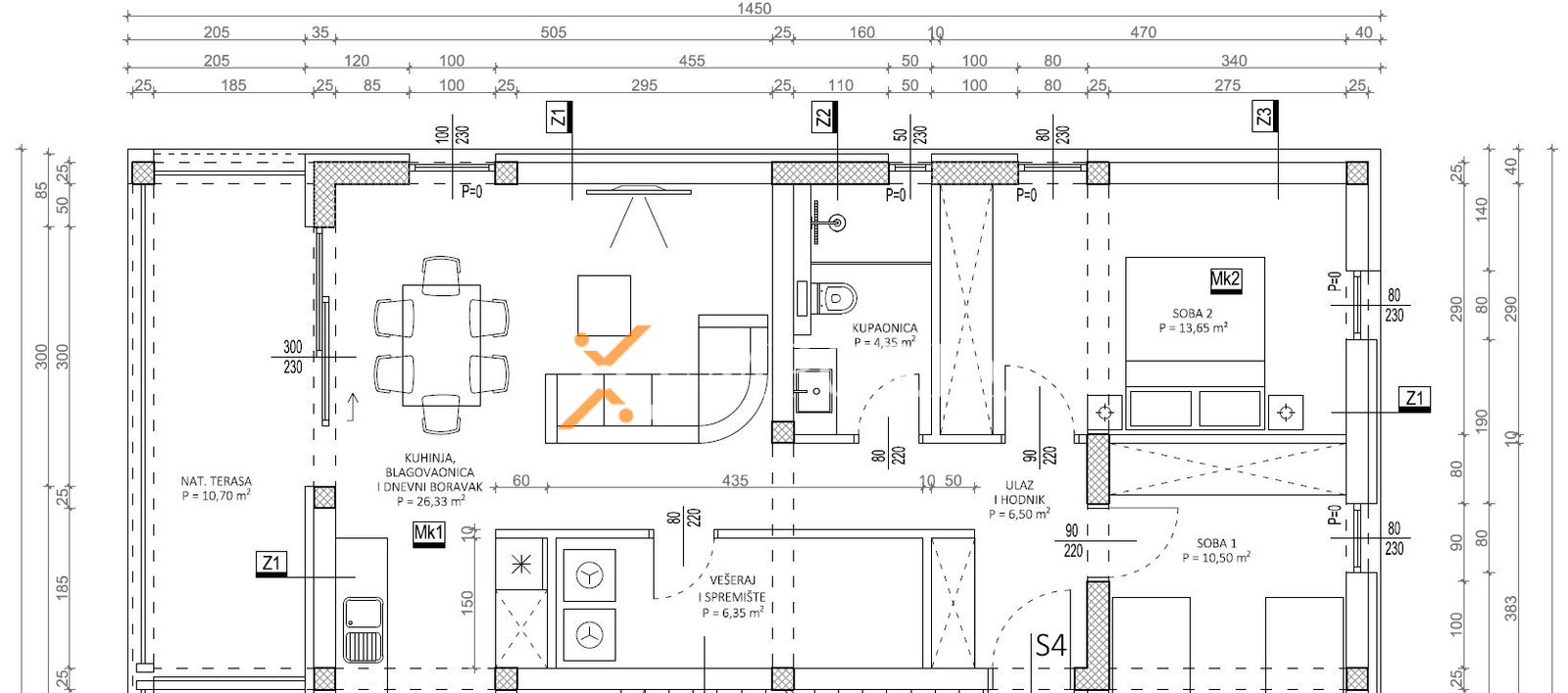 Stan se sastoji od hodnika, dvije spavaće sobe, kupaonice, praonice, kuhinje s blagovaonicom i dnevnim boravkom otvorenog koncepta te natkrivene terase. Neto korisna površina zatvorenih prostorija iznosi 73,03 m2. Dodatno, apartmanu pripadaju dva parkirna mjesta, stoga ukupna neto površina s pripacima iznosi 78,23 m2.