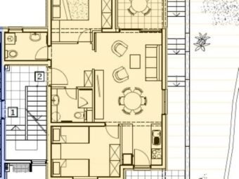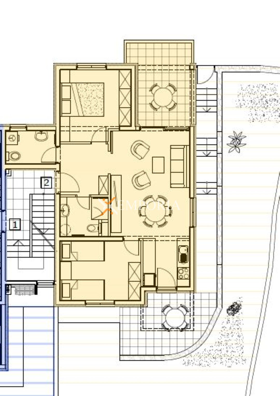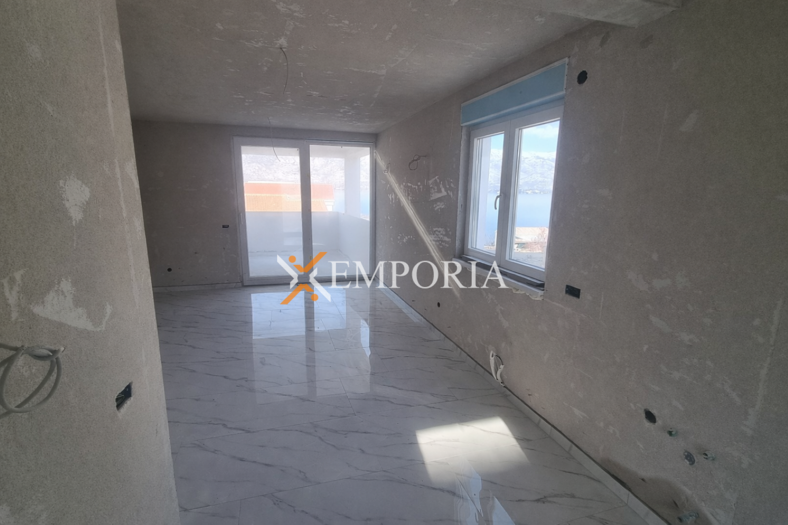 Apartman se sastoji od hodnika, dvije spavaće sobe, kupaonice, dodatnog wc-a, kuhinje s blagovaonicom i dnevnim boravkom, lođe te dijelom natkrivene terase. Neto korisna površina opisanih prostorija iznosi 70,85 m2. S lođe se pruža odličan pogled na more.