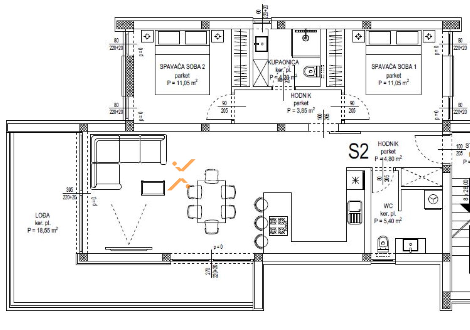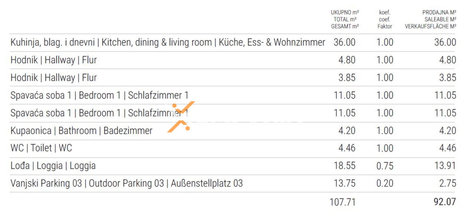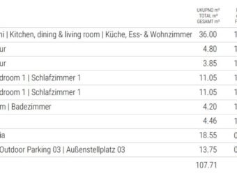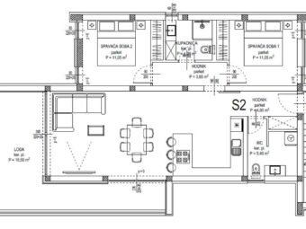 Raspored prostorija čine hodnik, dvije spavaće sobe, kupaonica, zaseban wc, kuhinja s blagovaonicom i dnevnim boravkom otvorenog koncepta te lođa. Neto korisna površina unutarnjeg prostora iznosi 89,32 m2. Stanu pripada jedno parkirno mjesto. Ukupna neto površina s pripacima iznosi 92,07 m2.