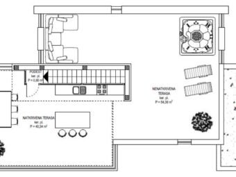 Posebna vrijednost ove nekretnine nalazi se na prostranoj krovnoj terasi koja je u potpunosti opremljena za luksuzan boravak na otvorenom. Terasa uključuje ljetnu kuhinju s plinskim roštiljem, indukcijskom pločom, sudoperom i kuhinjskim otokom s vinotekom. Nadalje, na terasi su postavljeni TV, stol za objed s osam stolica, dvije ležaljke te lounge zona s trosjedom, dvije lounge fotelje i stolićem. Predviđena je i priprema za jacuzzi. Natkriveni dio terase opremljen je ventilatorom i rasvjetom, čime se osigurava maksimalna udobnost tijekom dana i večernjih sati.