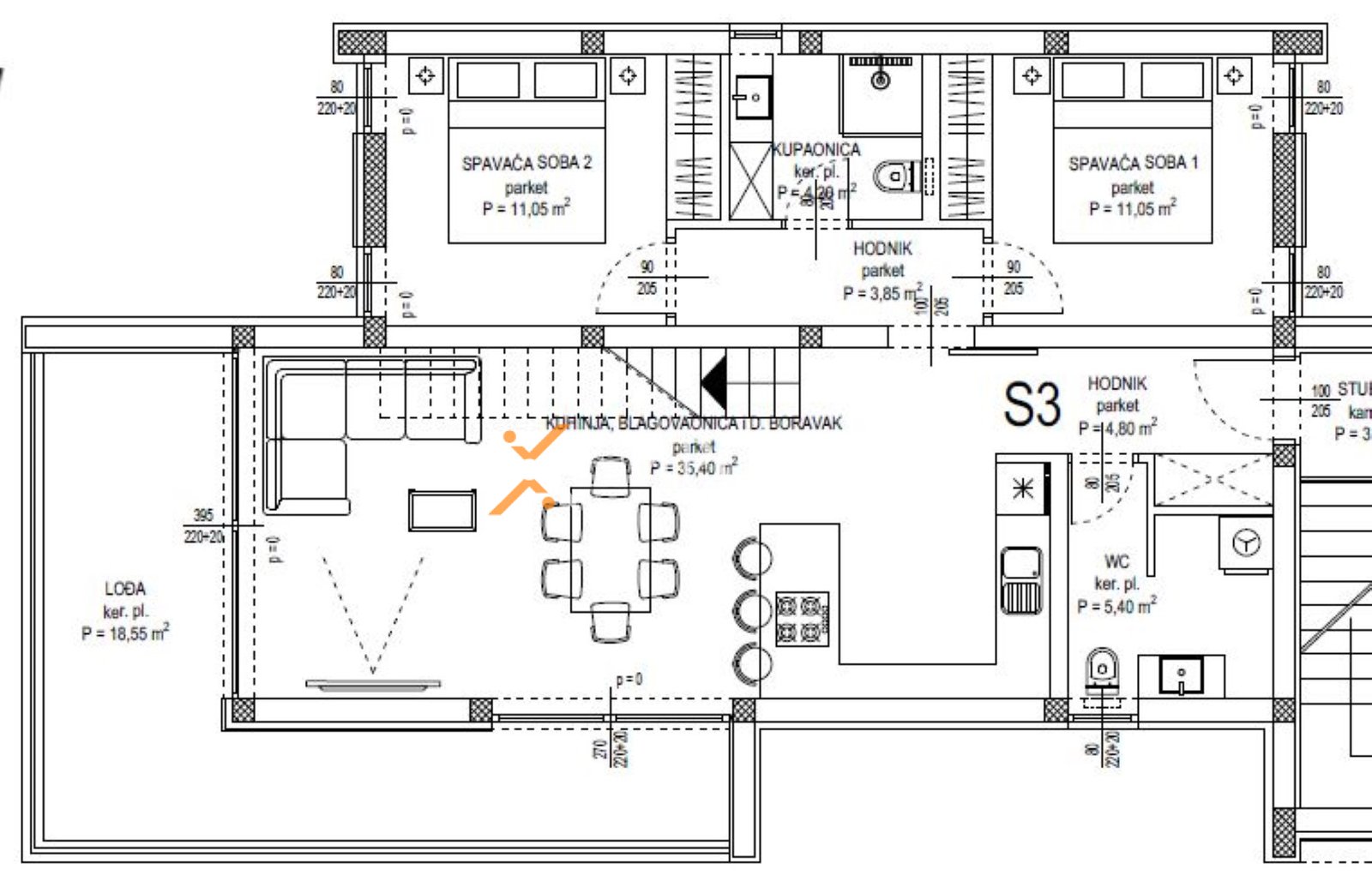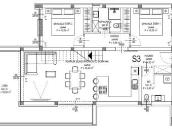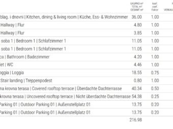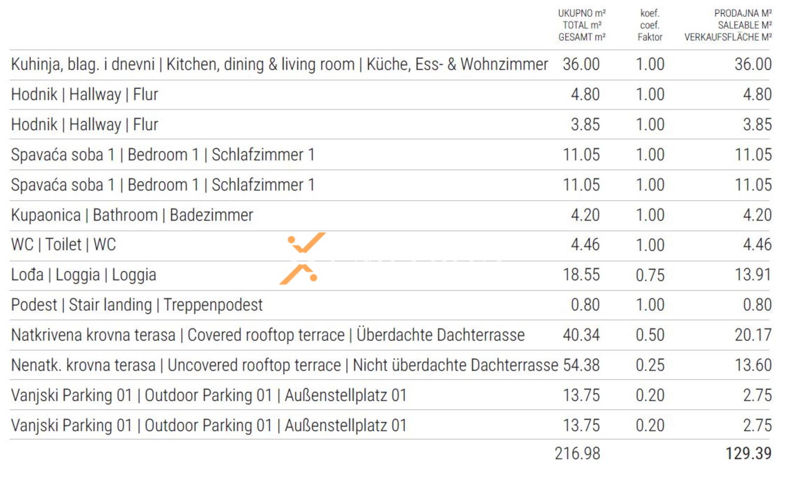 Raspored prostorija obuhvaća hodnik, dvije spavaće sobe, kupaonicu, zaseban wc, kuhinju s blagovaonicom i dnevnim boravkom te lođu neto površine 89,32 m2. Iz stubišta se pristupa impresivnoj krovnoj terasi površine 94,72 m2, od čega je 40,34 m2 natkriveno. Neto korisna površina opisanih prostorija iznosi 123,89 m2. Stanu pripadaju dva parkirna mjesta. Ukupna neto površina s pripacima iznosi 129,39 m2. Kupac ne plaća porez na promet nekretnina.