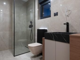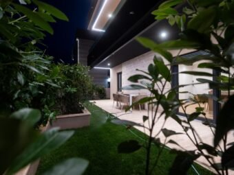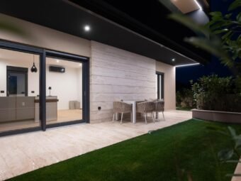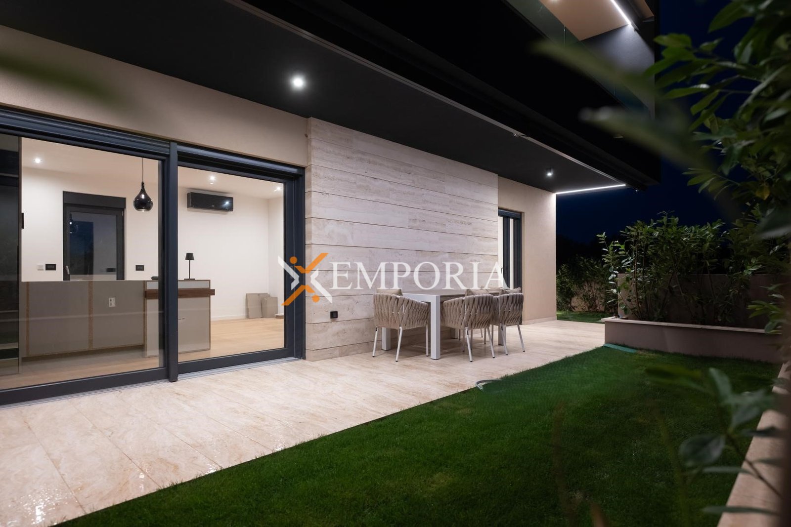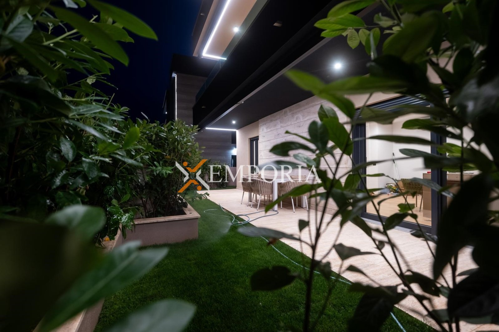Gradnja je izvedena ciglenim termo blokom uz fasadu s 10 cm stiropora. PVC stolarija s troslojnim staklom, električnim roletama i komarnicima pruža dodatnu toplinsku i zvučnu izolaciju. Ulazna vrata su protuprovalna i protupožarna, dok ravni betonski krov dodatno naglašava suvremeni arhitektonski stil.