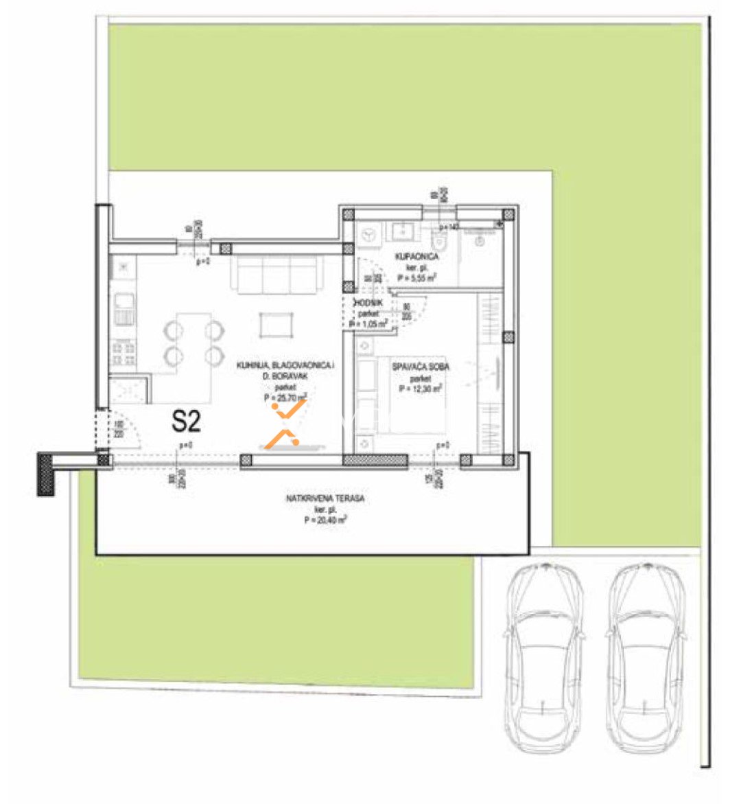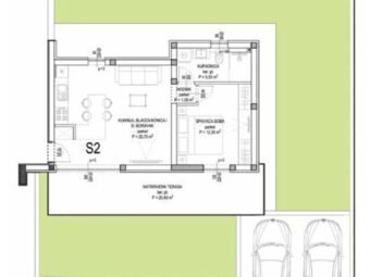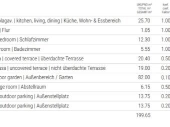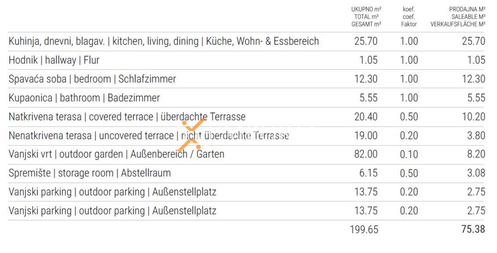 Raspored prostorija čine hodnik, spavaća soba, kupaonica, kuhinja s blagovaonicom i dnevnim boravkom otvorenog koncepta te natkrivena i nenatkrivena terasa. Neto korisna površina unutarnjeg prostora iznosi 58,60 m2. Nadalje, stanu pripada prostrani vrt površine 82 m2, spremište od 6,15 m2 u podrumskom dijelu zgrade te dva vanjska parkirna mjesta. Ukupna neto površina s pripacima iznosi 75,38 m2.