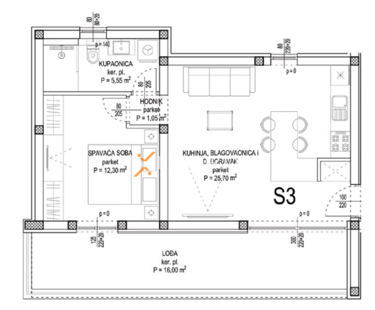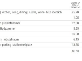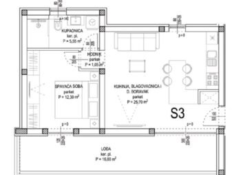 Raspored prostorija čine hodnik, spavaća soba, kupaonica, kuhinja s blagovaonicom i dnevnim boravkom otvorenog koncepta te lođa. Neto korisna površina unutarnjeg prostora iznosi 56,60 m2. Stanu pripada spremište od 6,15 m2 u podrumskom dijelu zgrade te jedno vanjsko parkirno mjesto. Ukupna neto površina s pripacima iznosi 62,43 m2.
