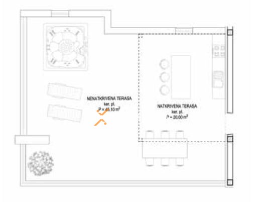 Posebna vrijednost ove nekretnine nalazi se na krovnoj terasi koja je potpuno opremljena za luksuzan boravak na otvorenom. Terasa uključuje ljetnu kuhinju s plinskim roštiljem, indukcijskom pločom, sudoperom i kuhinjskim otokom s vinotekom. Nadalje, na terasi su postavljeni TV, stol za objed s osam stolica, dvije ležaljke te priprema za jacuzzi. Natkriveni dio terase opremljen je ventilatorom i rasvjetom, čime se osigurava maksimalna udobnost tijekom cijelog dana i večernjih sati.