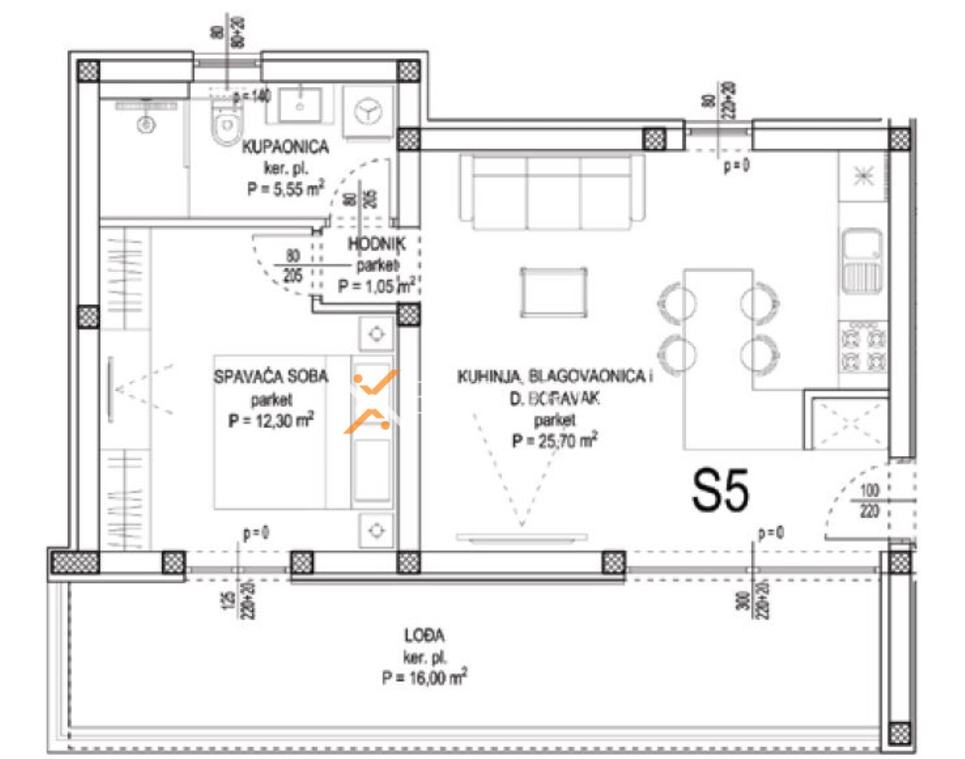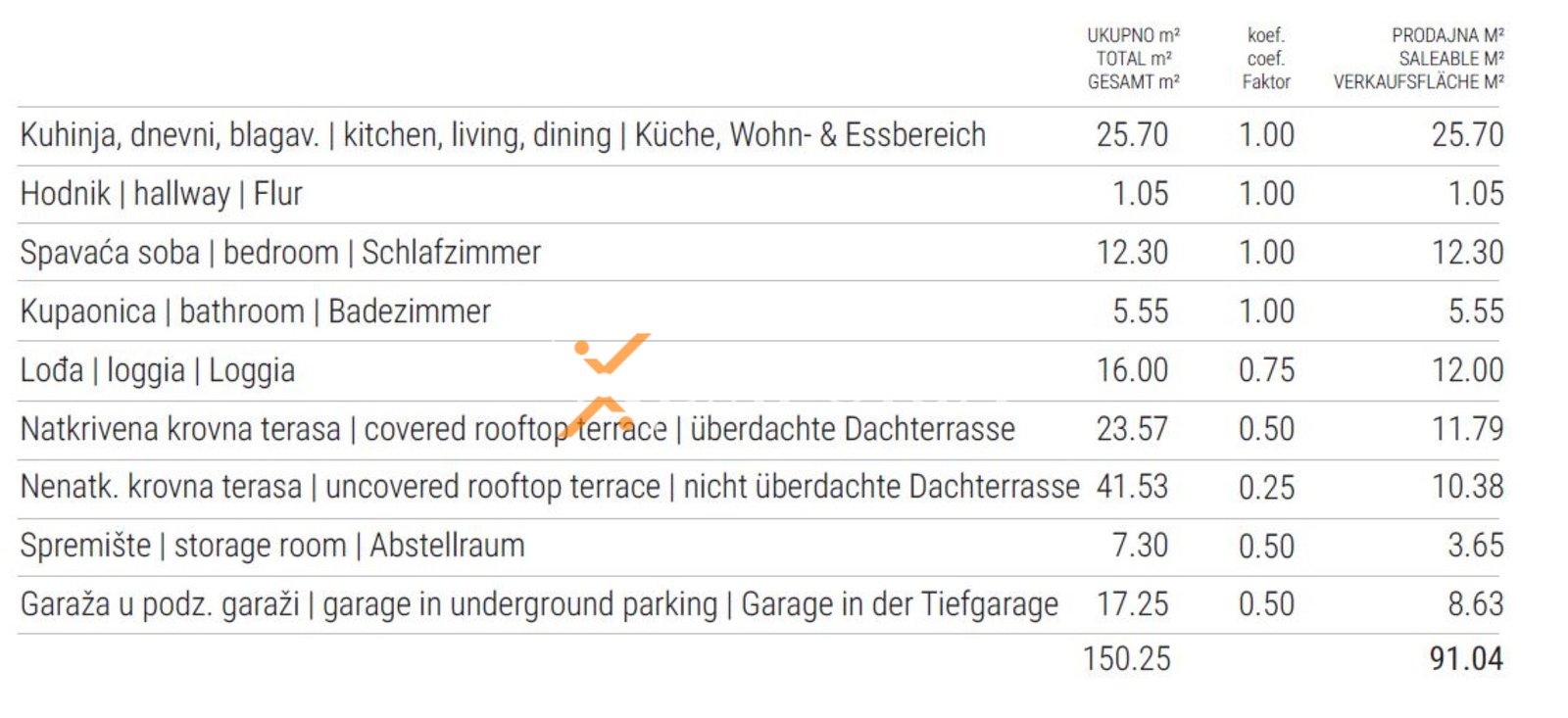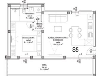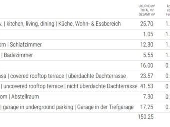 Raspored prostorija obuhvaća hodnik, spavaću sobu, kupaonicu, kuhinju s blagovaonicom i dnevnim boravkom te lođu, ukupne neto površine 56,60 m2. Iz stubišta se pristupa prostranoj krovnoj terasi površine 65,10 m2, od čega je 23,57 m2 natkriveno. Neto korisna površina opisanih prostorija iznosi 78,76 m2. Stanu pripada spremište od 7,30 m2 u podrumu te jedno garažno parkirno mjesto. Ukupna neto površina s pripacima iznosi 91,04 m2.