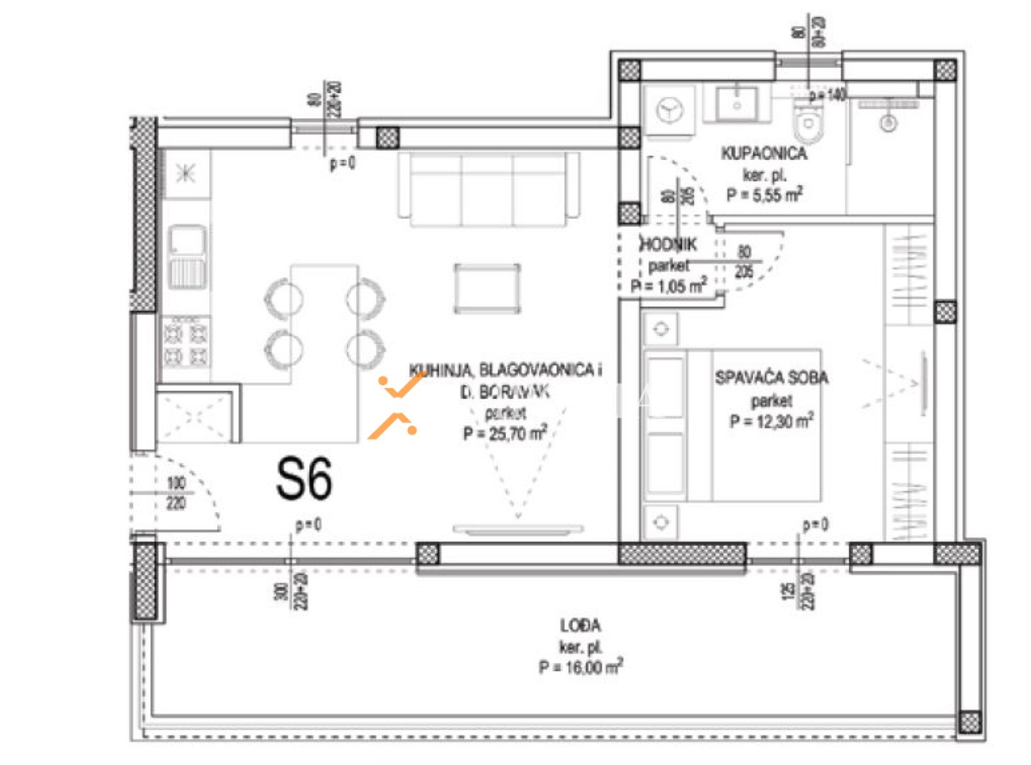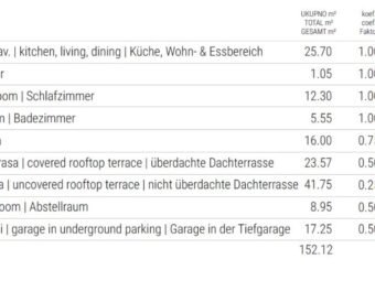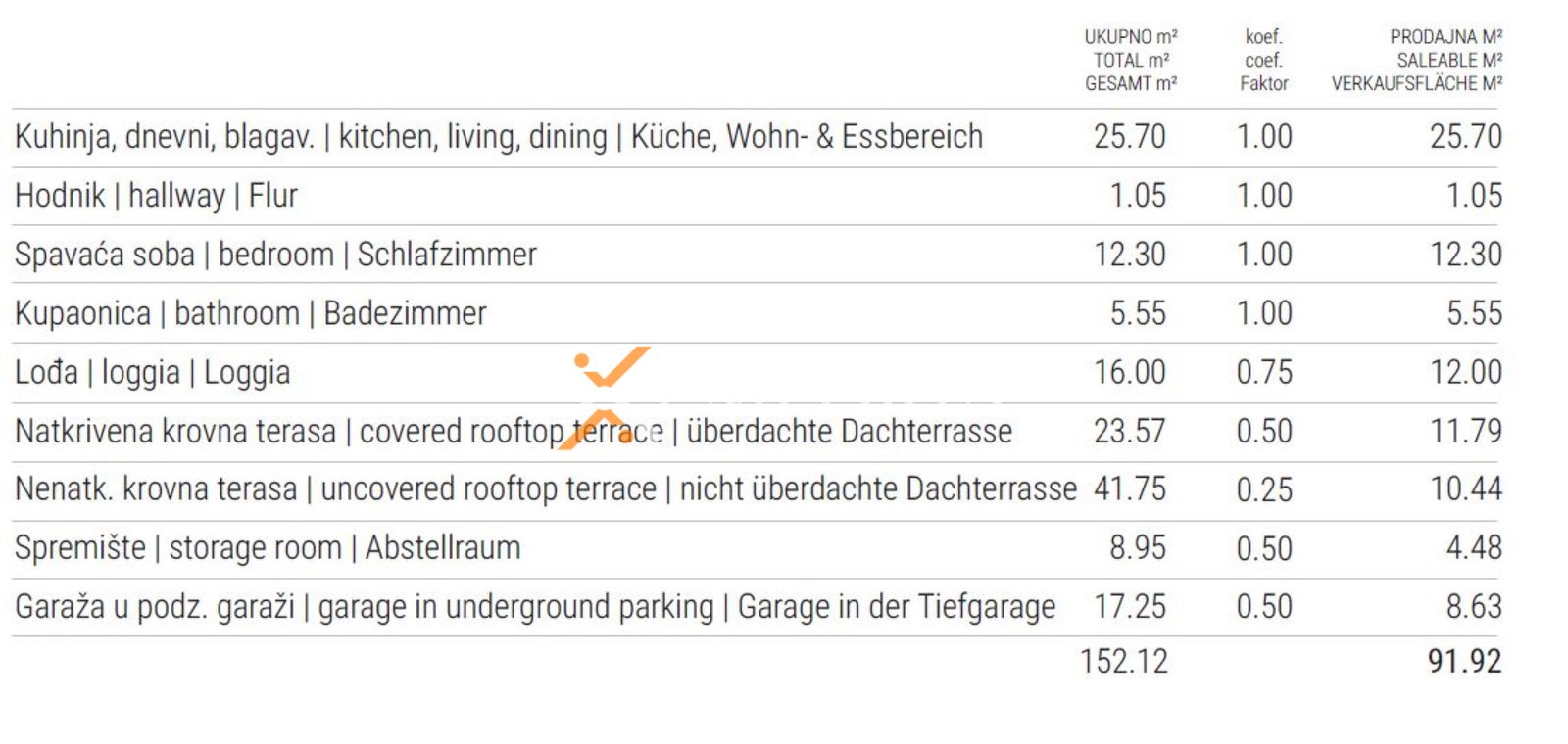 Raspored prostorija obuhvaća hodnik, spavaću sobu, kupaonicu, kuhinju s blagovaonicom i dnevnim boravkom te lođu neto površine 56,60 m2. Iz stubišta se pristupa prostranoj krovnoj terasi površine 65,10 m2, od čega je 23,57 m2 natkriveno. Neto korisna površina opisanih prostorija iznosi 78,76 m2. Stanu pripada spremište od 8,95 m2 u podrumskom dijelu zgrade te jedno garažno parkirno mjesto. Ukupna neto površina s pripacima iznosi 91,92 m2.