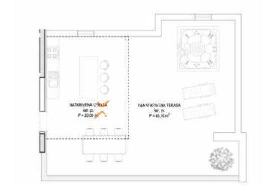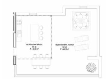 Posebna vrijednost ove nekretnine nalazi se na krovnoj terasi koja je potpuno opremljena za luksuzan boravak na otvorenom. Terasa uključuje ljetnu kuhinju s plinskim roštiljem, indukcijskom pločom, sudoperom i kuhinjskim otokom s vinotekom. Nadalje, na terasi su postavljeni TV, stol za objed s osam stolica, dvije ležaljke te priprema za jacuzzi. Natkriveni dio terase opremljen je ventilatorom i rasvjetom, čime se osigurava maksimalna udobnost tijekom dana i večernjih sati.