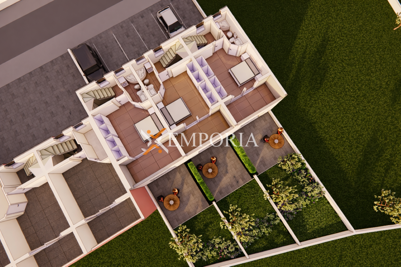 Raspored prostorija obuhvaća prizemlje gdje se nalaze hodnik, kupaonica te kuhinja s blagovaonicom i dnevnim boravkom, površine 33,20 m² neto. Na prvom katu nalaze se hodnik, spavaća soba, kupaonica i lođa (30,90 m² neto). Na drugom katu nalaze se hodnik, spavaća soba, kupaonica i lođa (30,90 m² neto). Stan se može preurediti u 3 studio apartmana.