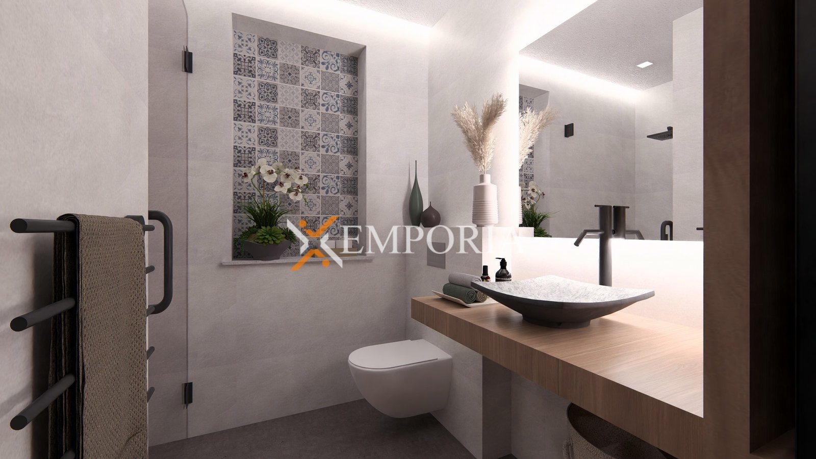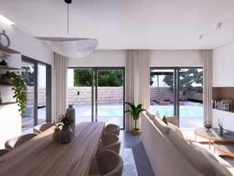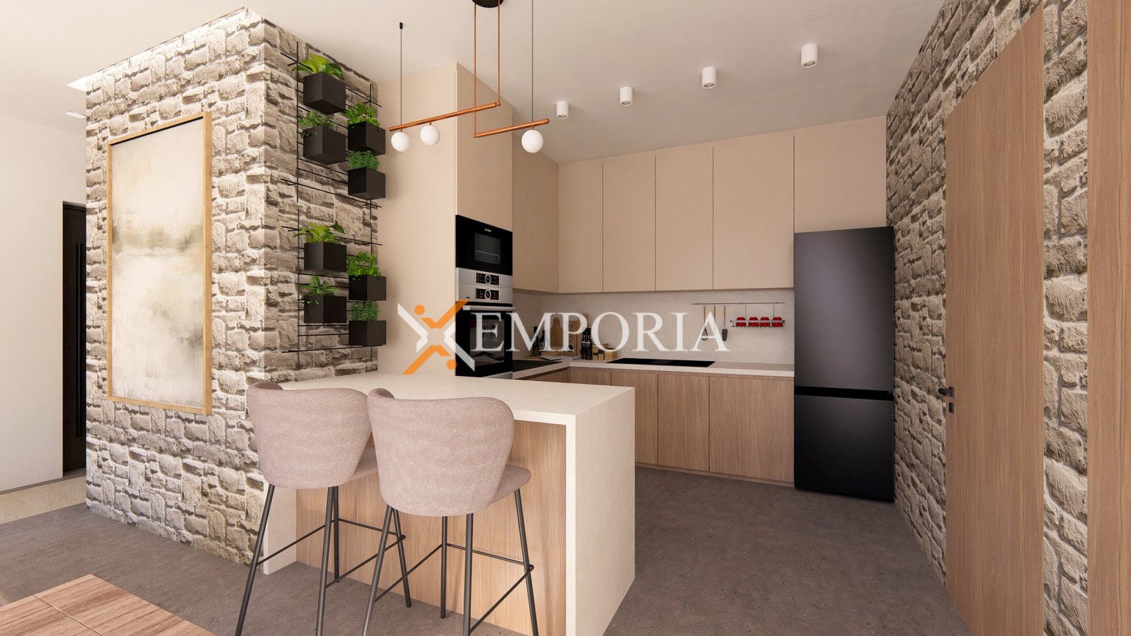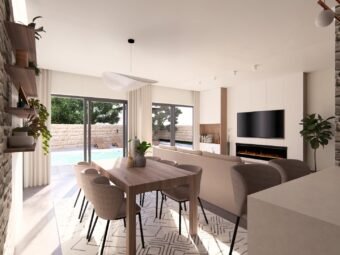 Gradnja se izvodi kvalitetnim ciglenim termo blokom, dok je fasada izolirana stiroporom debljine 10 cm. Ugrađena je aluminijska stolarija s troslojnim staklom, električnim roletama i komarnicima. Podne obloge čine kombinacija pločica i parketa, dok su ulazna vrata protuprovalna i protupožarna. Kuhinja je uključena u cijenu, što dodatno olakšava useljenje.