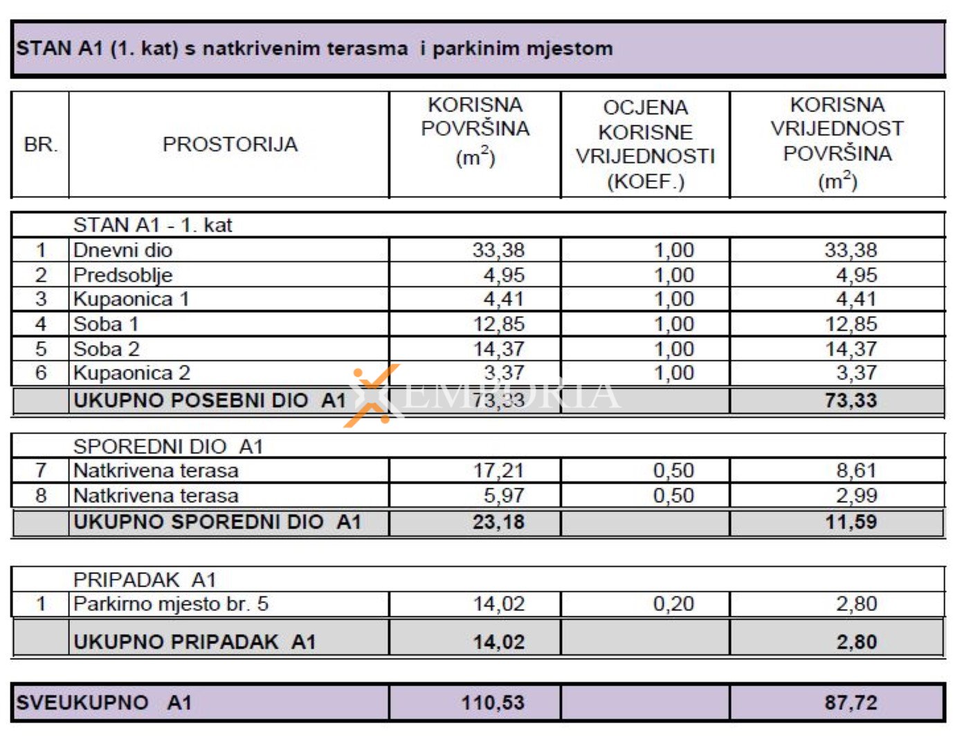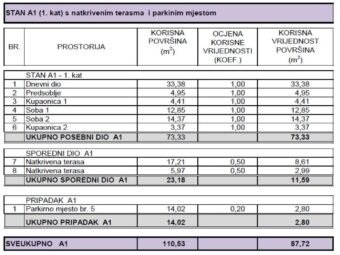Neto korisna površina opisanih prostorija iznosi 84,92 m2, dok ukupna neto površina s pripacima iznosi 87,72 m2.