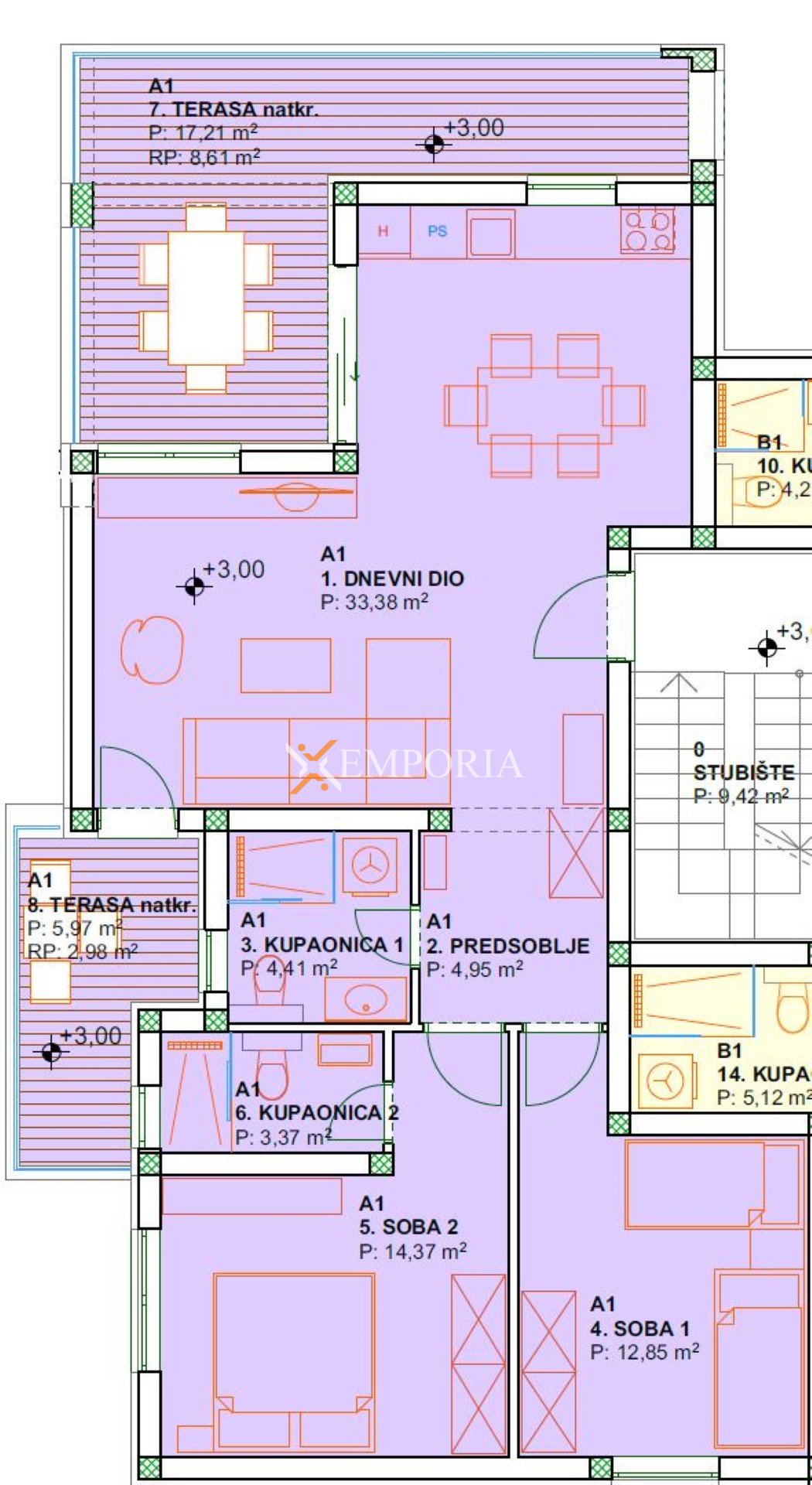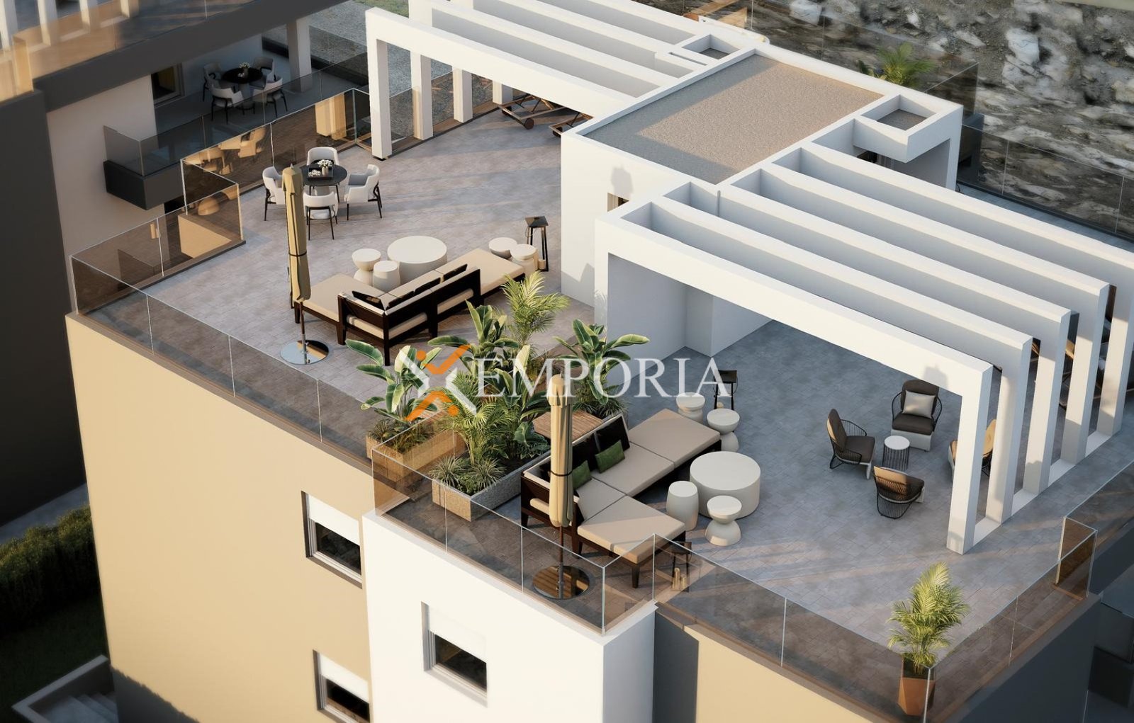Apartman se nalazi na prvom katu. Raspored prostorija čine hodnik, spavaća soba, spavaća soba s vlastitom kupaonicom, dodatna kupaonica, kuhinja s blagovaonicom i dnevnim boravkom te dvije natkrivene terase.