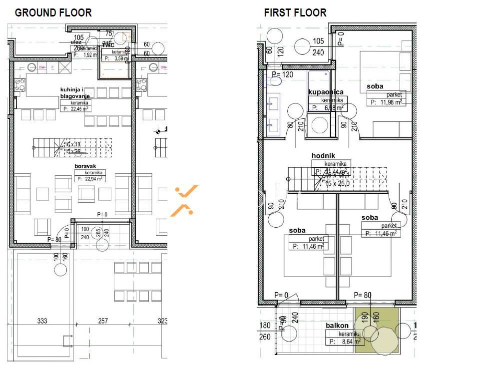 Prizemlje: ulaz, wc, kuhinja s blagovaonicom, dnevni boravak, terasa i unutarnje stepenište