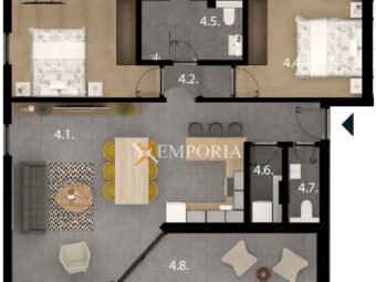 U zgradi se ukupno nalazi 6 stanova. Raspoređeni su na prizemlju, prvom i drugom katu zgrade. Nadalje, gradnja je izvedena betonskim zidom. Krov je izveden ravno što naglašava moderne arhitektonske linije objekta. Prozori su aluminijski s električnim roletama i troslojnim staklom. Osim toga, fasada ima termoizolaciju 10 cm. U stanu su se za oblaganje poda koristili parketi i pločice. Klima uređaji su postavljeni u dnevnom boravku i spavaćim sobama. Dakle, ugrađena su ukupno 3 uređaja za grijanje i hlađenje prostorija. Uz to je u svim prostorijama osim spavaćih soba provedeno podno grijanje na struju. Na kraju, ulazna vrata stana su protuprovalna i protupožarna.